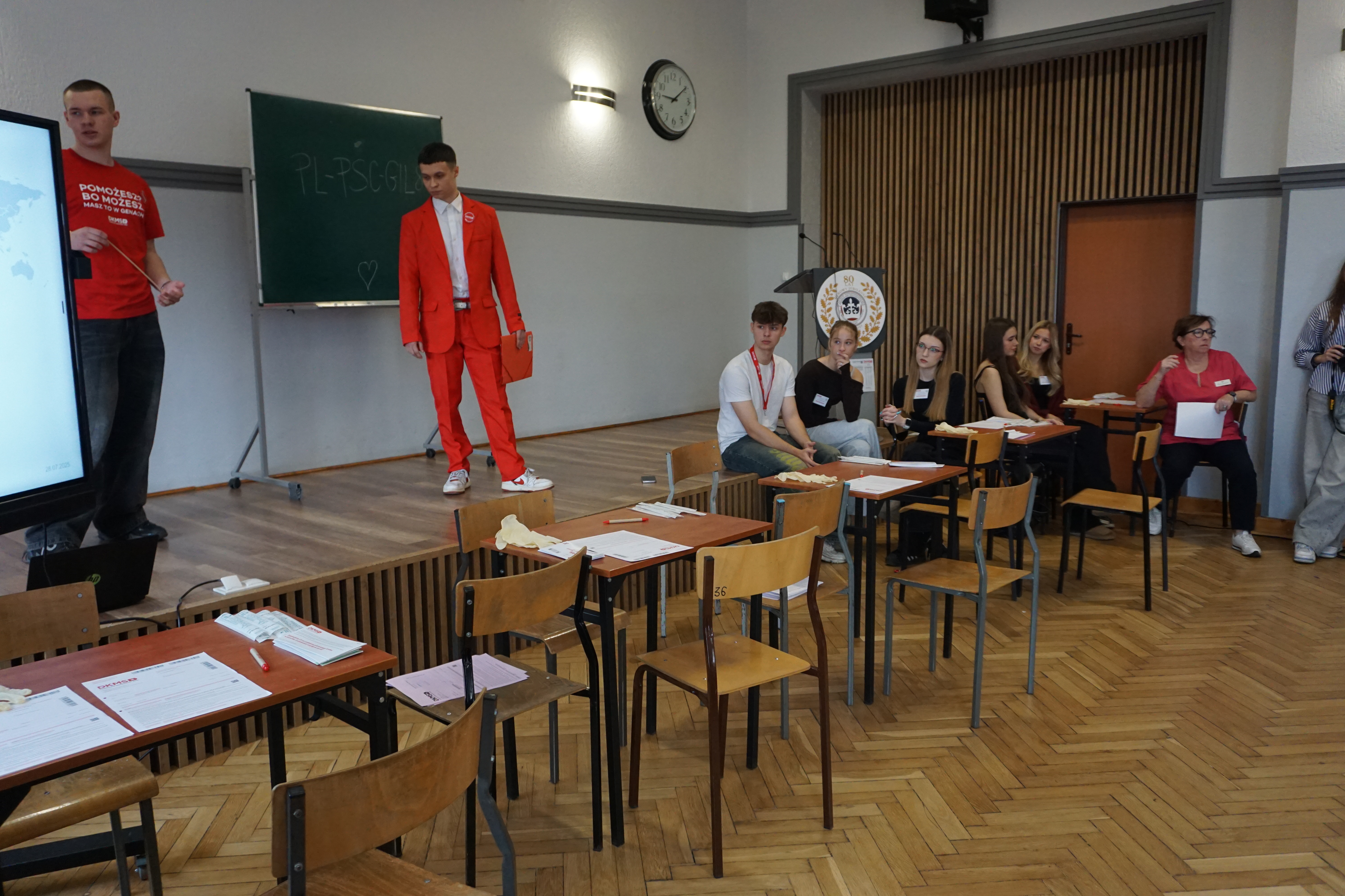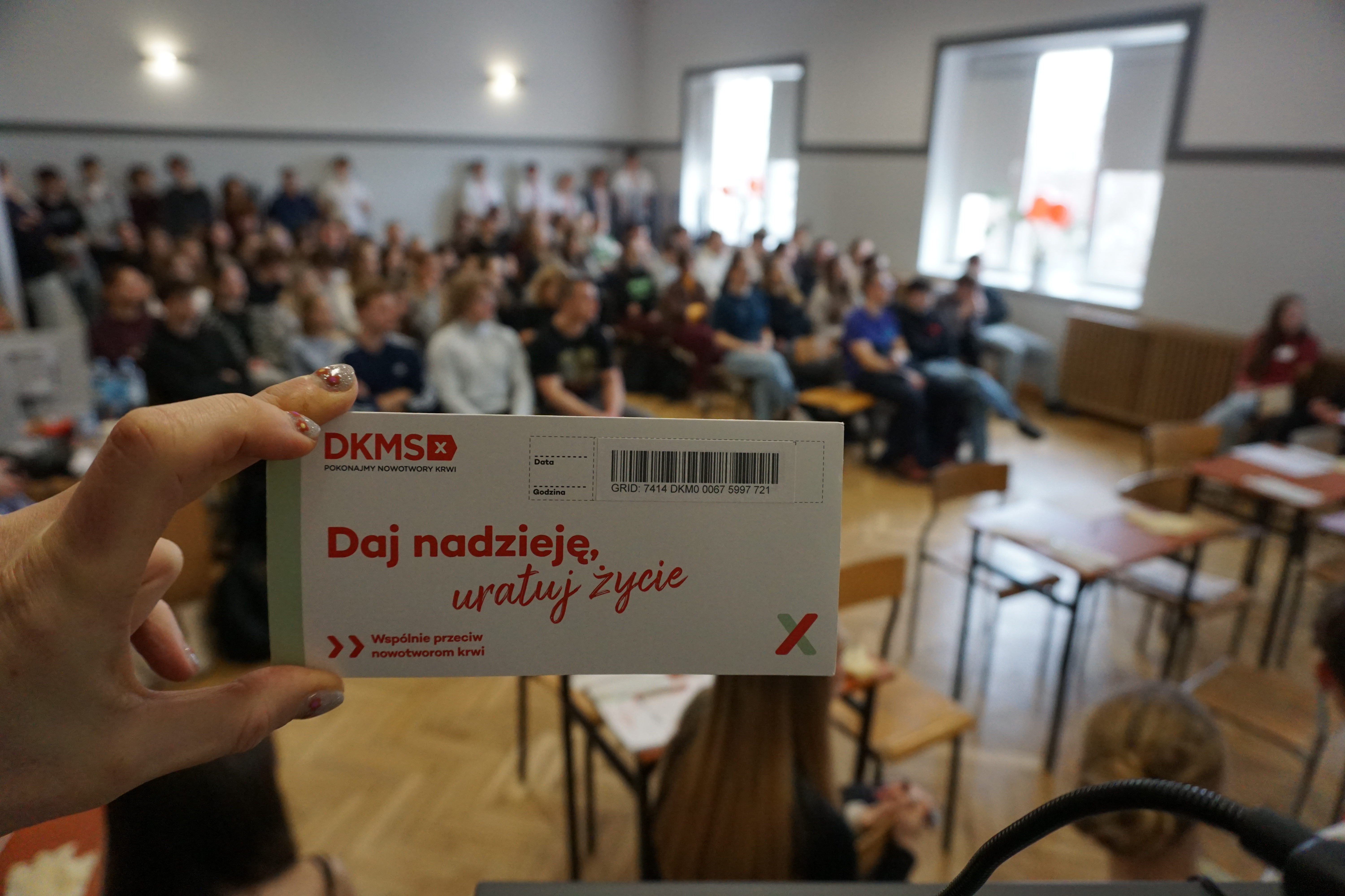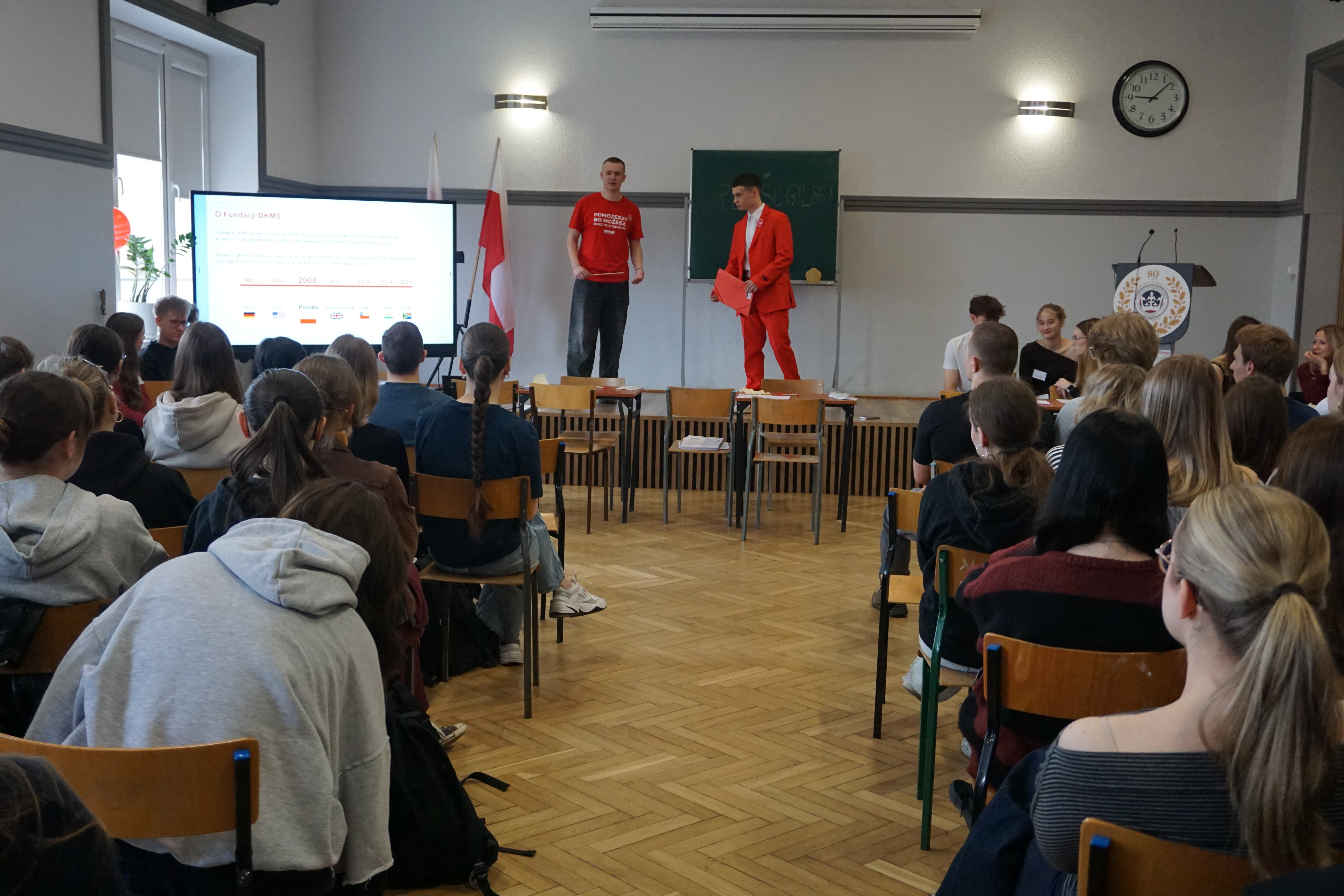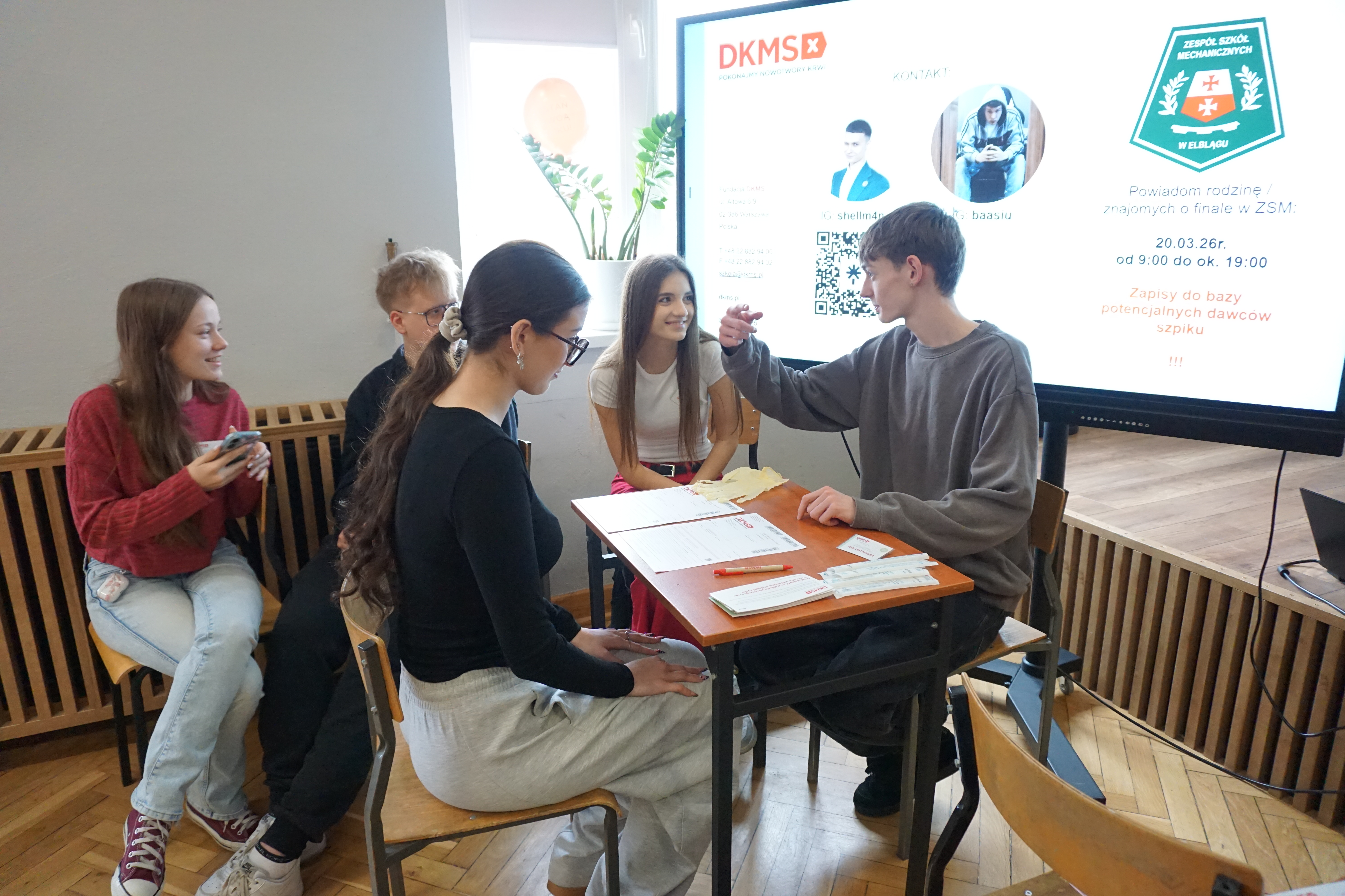 Czwartek (17 marca 26 rok)był dniem wyjątkowym. Tego dnia przybyli do nas goście z fundacji DKMS czyli fundacji zajmującej się poszukiwanie dawców szpiku.