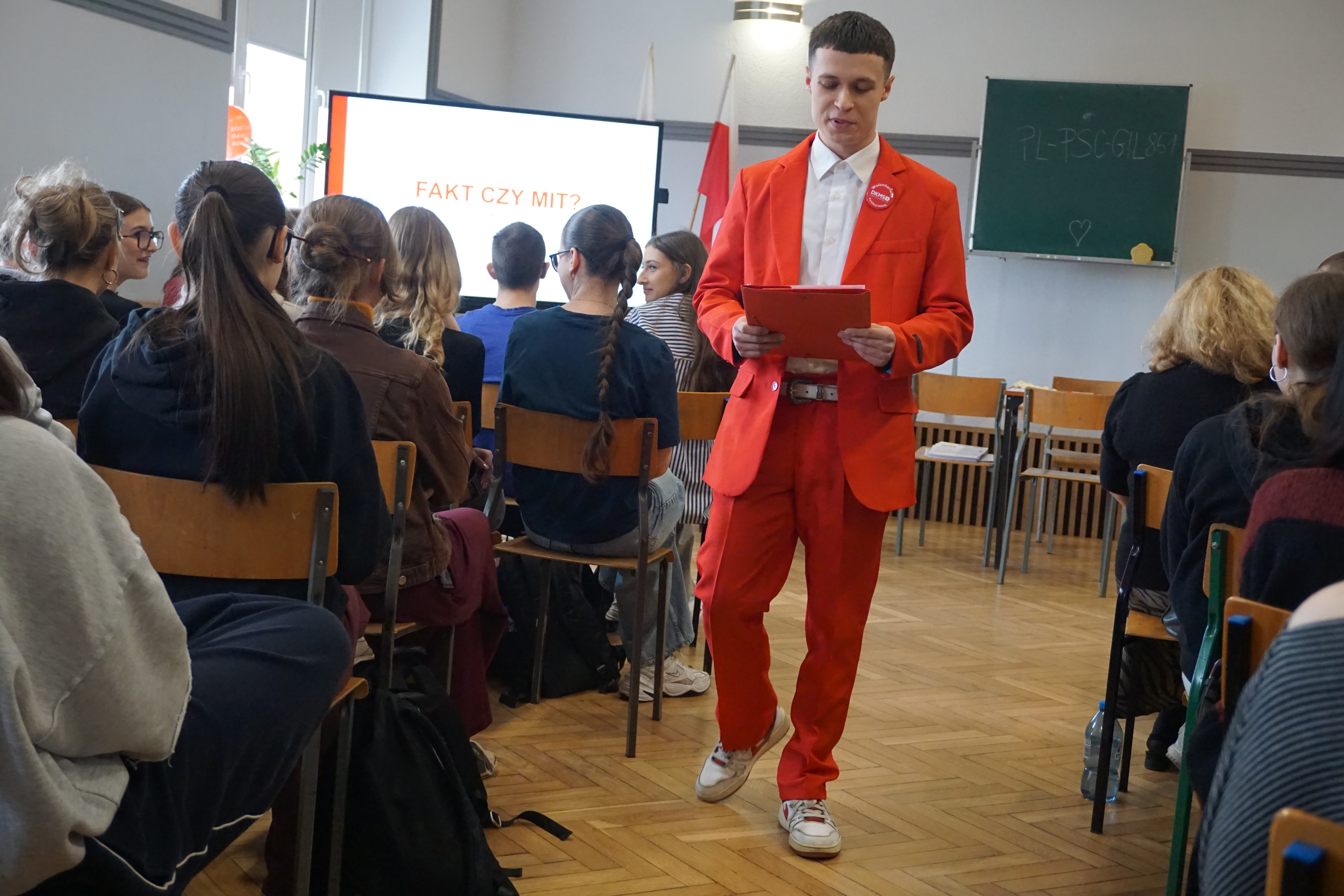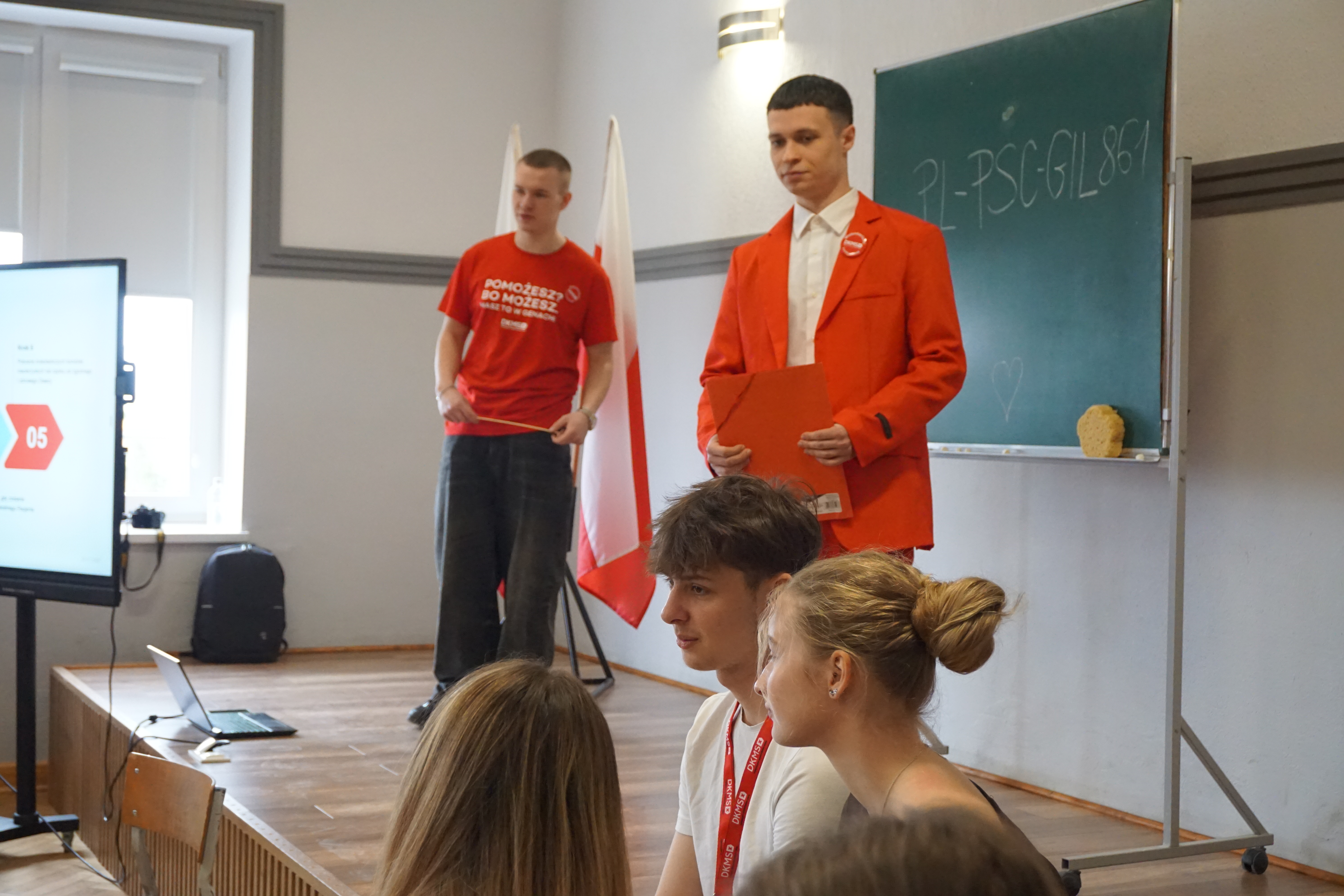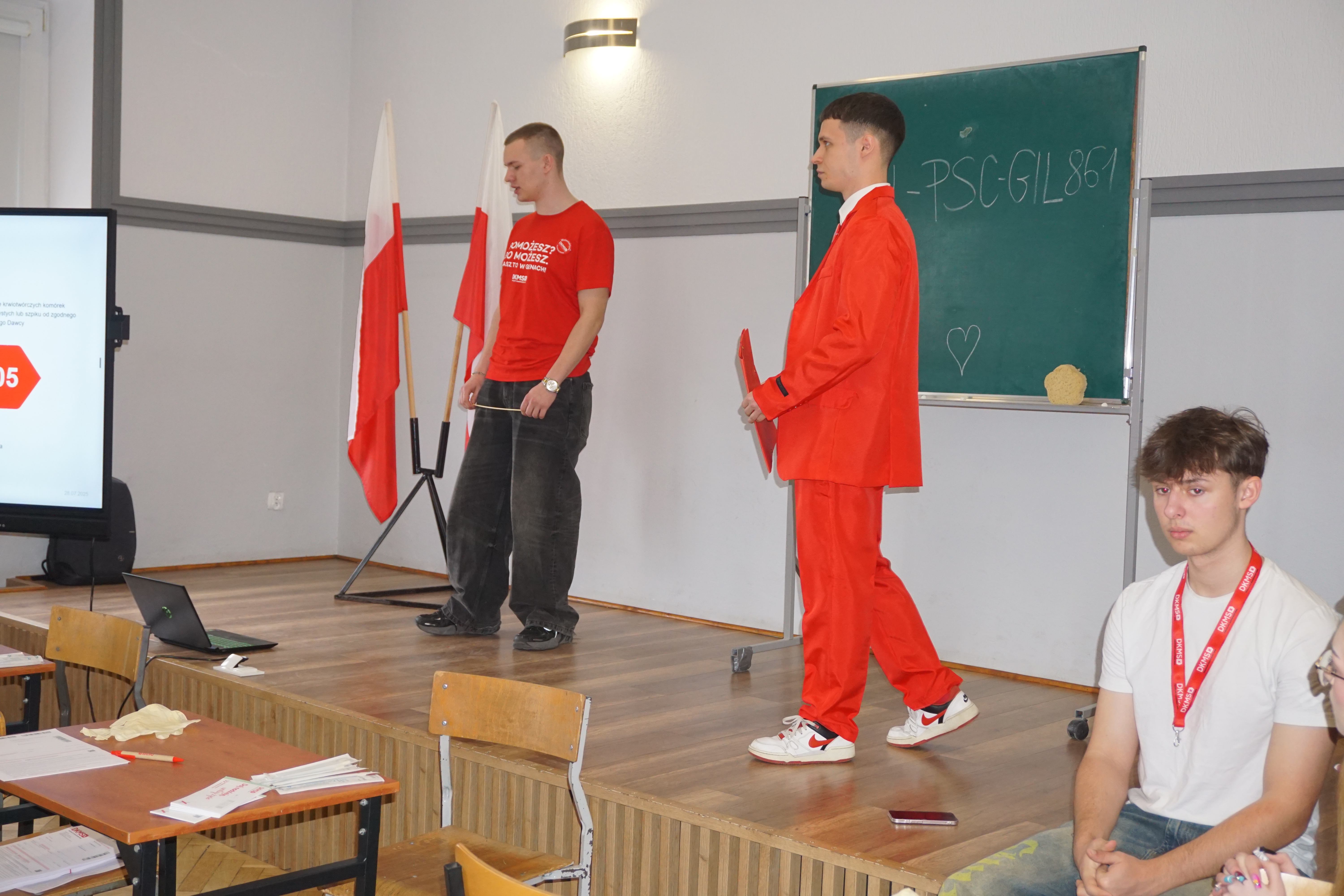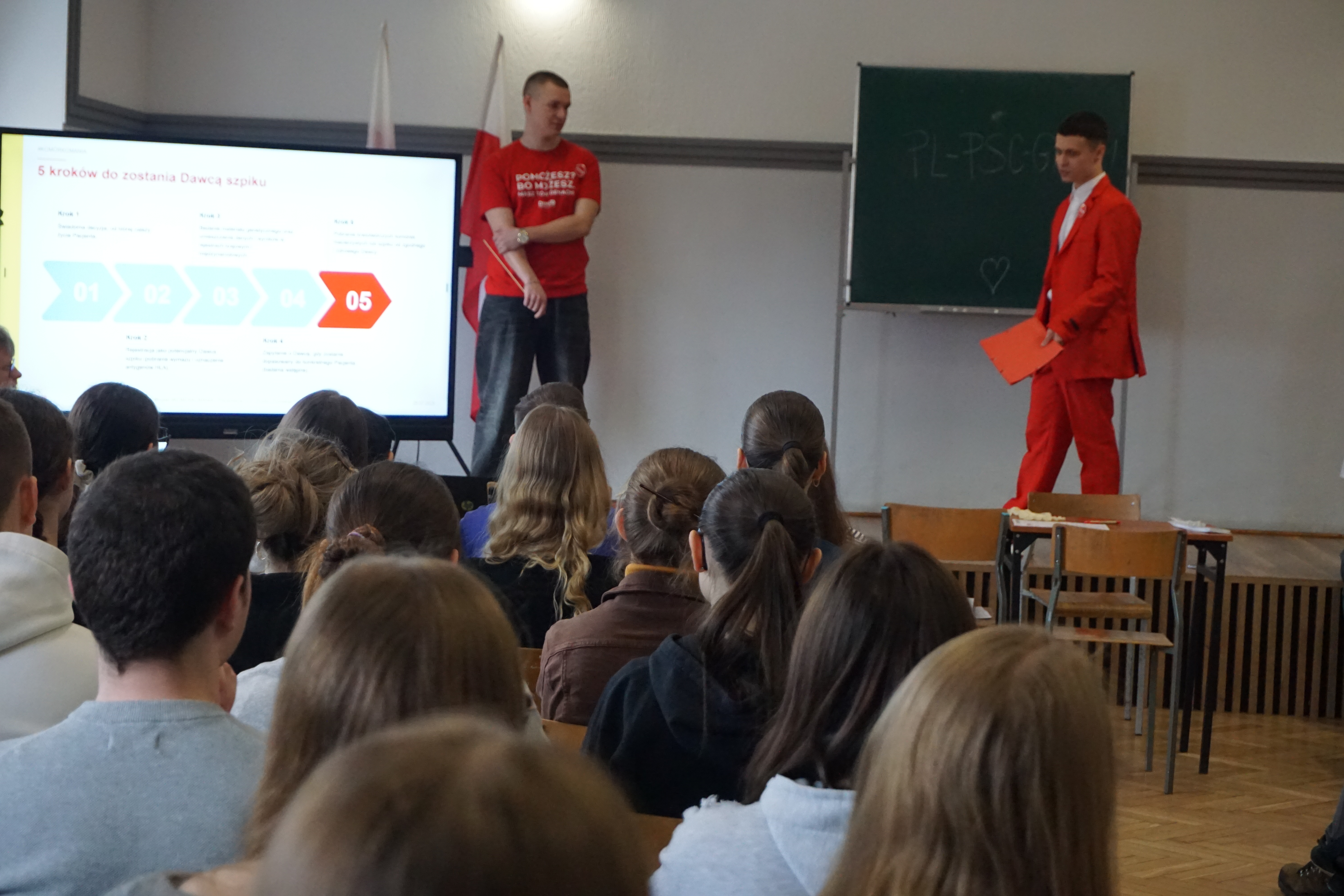 Czwartek (17 marca 26 rok)był dniem wyjątkowym. Tego dnia przybyli do nas goście z fundacji DKMS czyli fundacji zajmującej się poszukiwanie dawców szpiku.