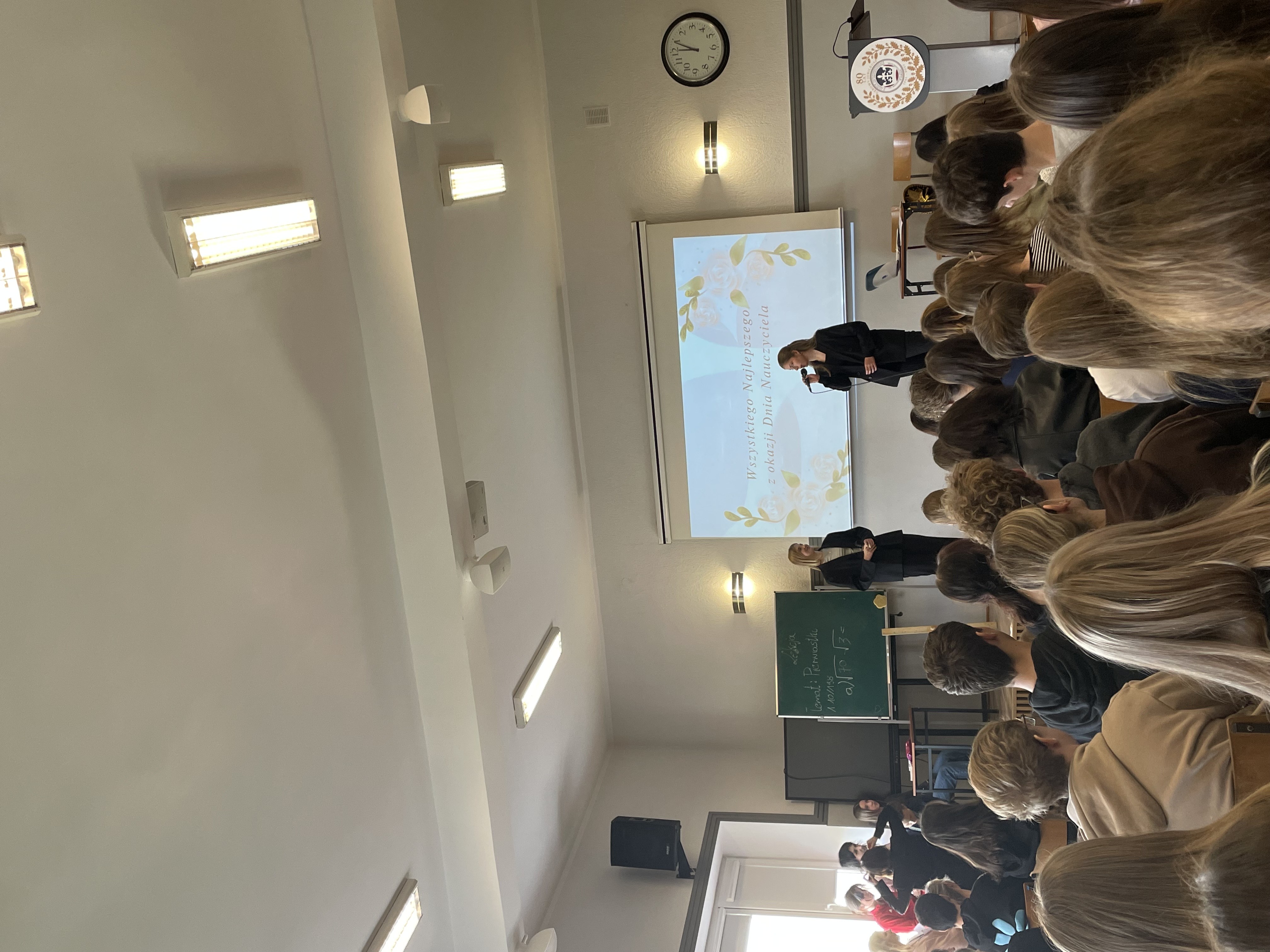 Nie zabrakło również podziękowań dla nauczycieli – za codzienną pracę, cierpliwość i oddanie. Uroczystość uświetniło humorystyczne przedstawienie, w którym uczniowie w żartobliwy sposób zaprezentowali sylwetki wybranych nauczycieli, ukazując ich z przymrużeniem oka, ale też z ogromną sympatią i szacunkiem.