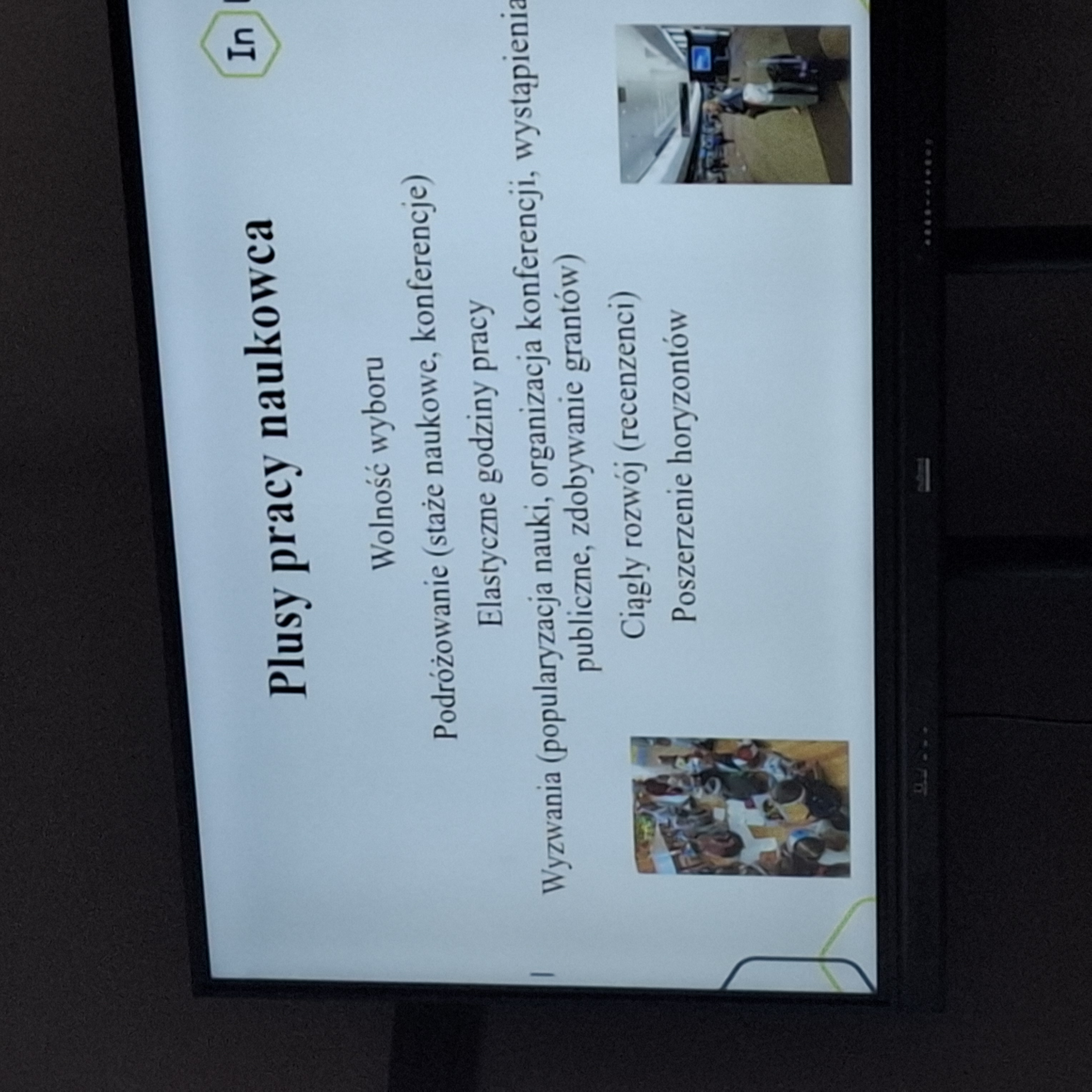 Pani profesor, podczas wykładu pt. "Naukowcy z pasją - podaj dalej" opowiadała o swojej karierze naukowej i badaniach. Pokazała wady i zalety pracy naukowca, a przede wszystkim uświadomiła nam, że po ukończeniu nauki w klasie biologiczno- chemicznej czeka nas ogromna różnorodność dróg do wyboru. Medycyna nie jest jedyną opcją.