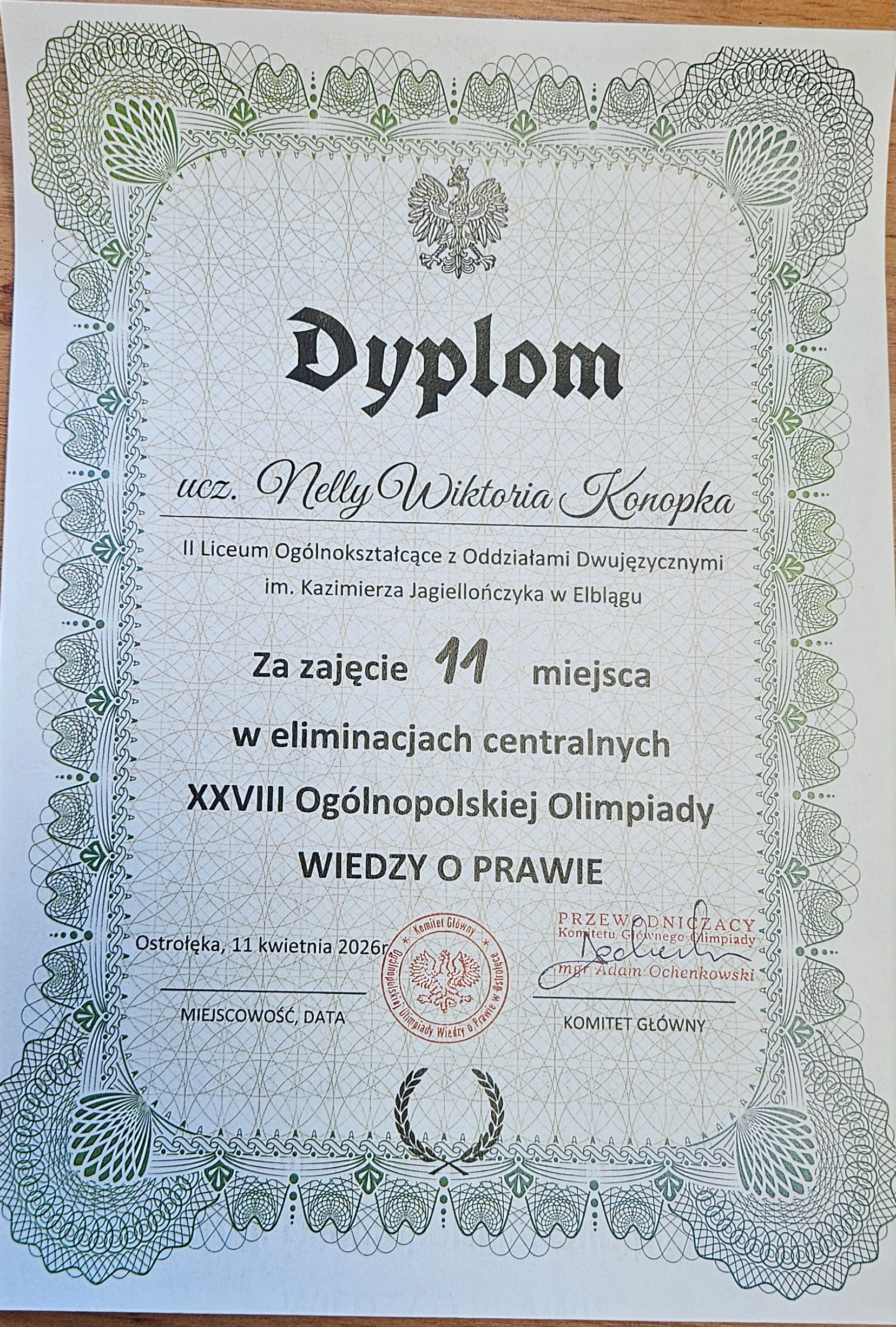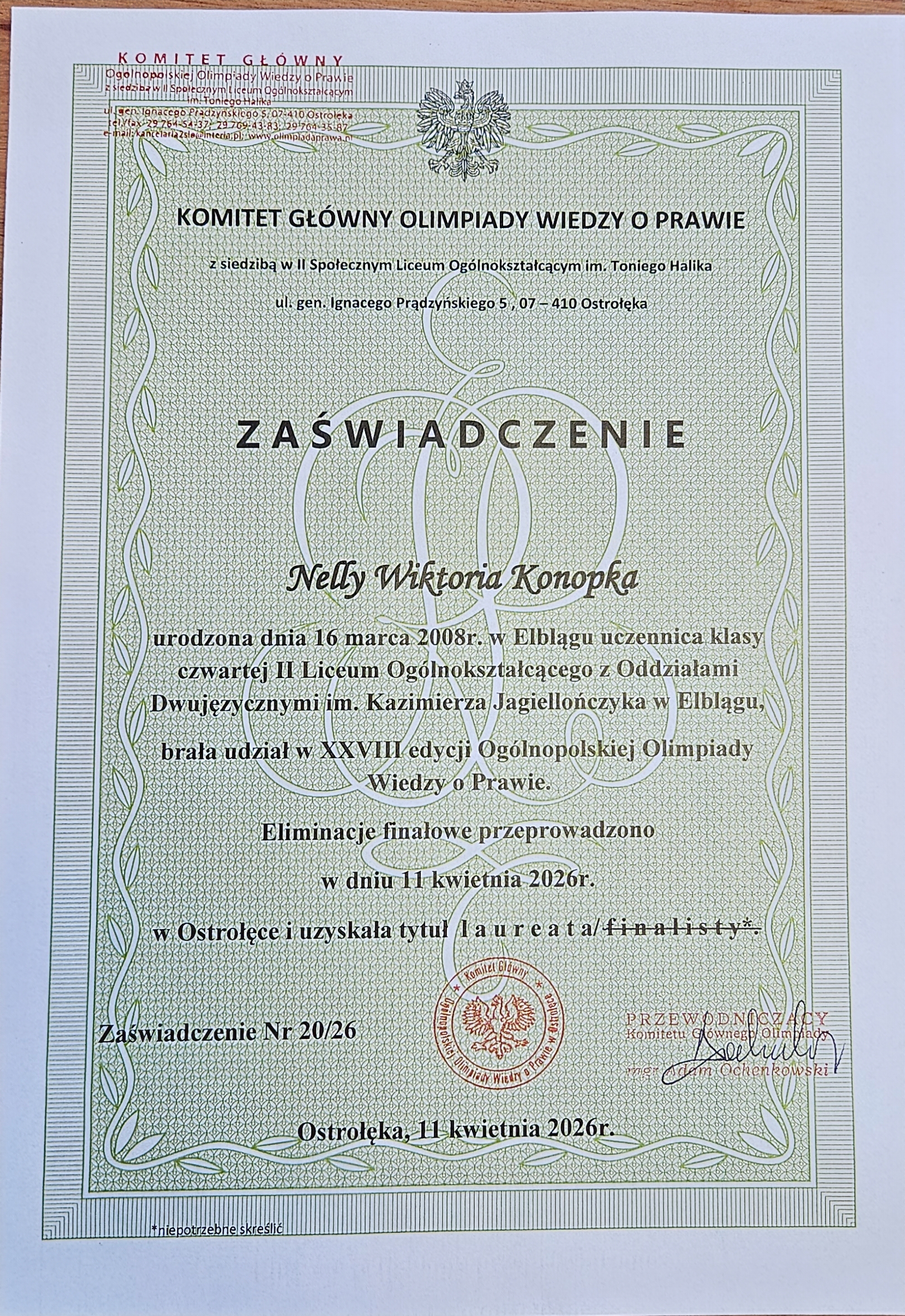 Uczennica klasy maturalnej Nelly Konopka zdobyła tytuł Laureata w finale XXVIII edycji Olimpiady Wiedzy o Prawie. Final przeprowadzony został 1 kwietnia 2026 r., w Ostrołęce.
