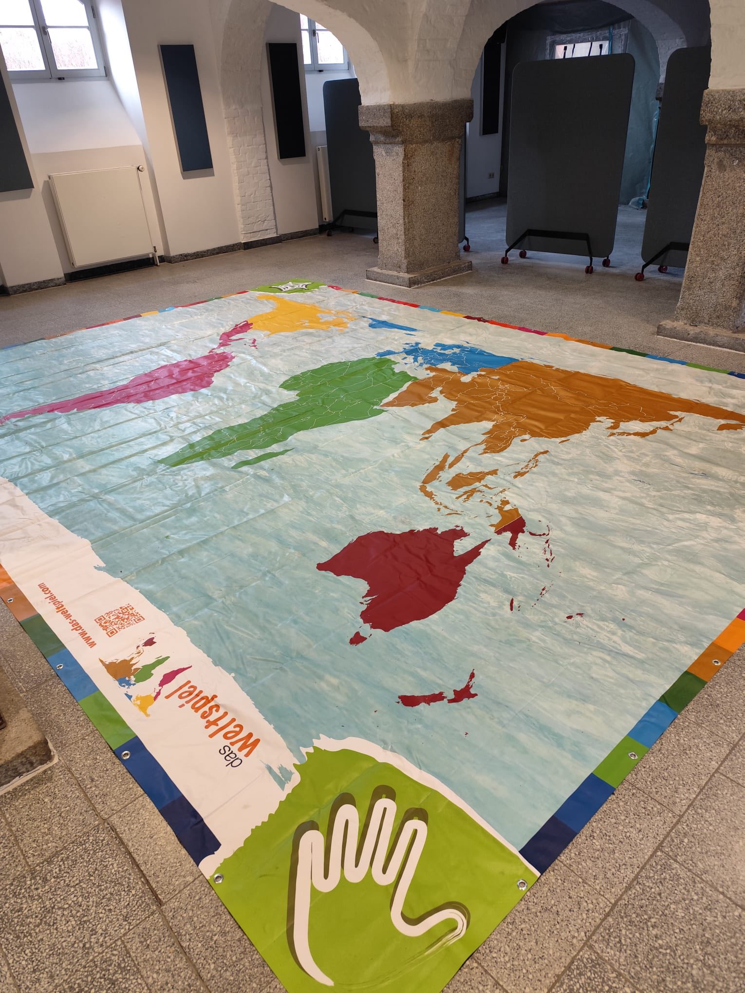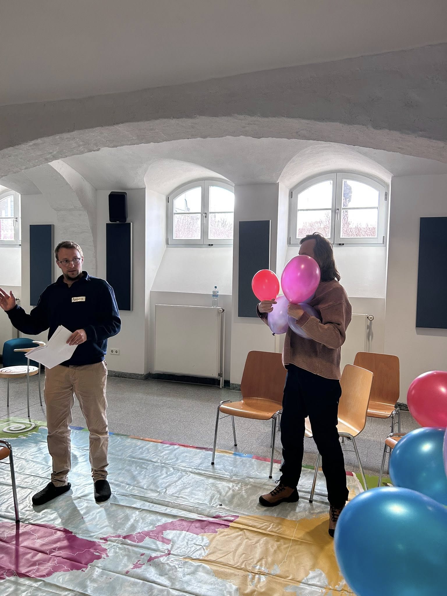 Najpierw ustawiiliśmy się na ogromnej mapie na podłodze, żeby pokazać rozmieszczenie ludności - w Azji zrobiło się tak tłoczno, że ledwo starczyło mapy. Później przyszedł czas na krzesła, którymi zaznaczaliśmy podział bogactwa między kontynentami - wyszło nam kilka bardzo wygodnych miejsc i sporo takich, gdzie o jedno krzesło trwałaby długa kłótni. Na koniec dmuchaliśmy balony, żeby zobrazować emisje CO₂ - niektótym brakowało rąk, inni trzymali malutki balonik.