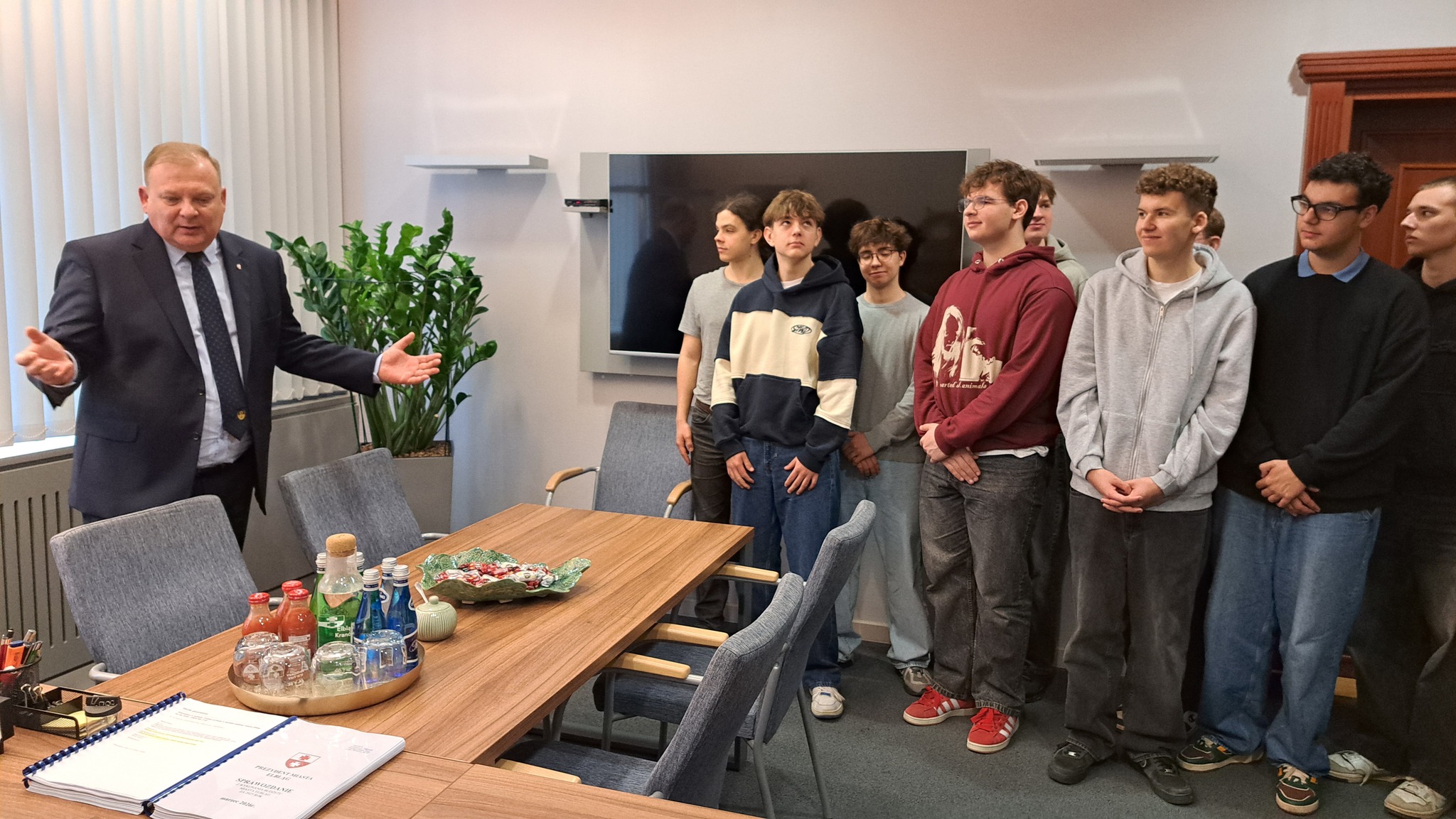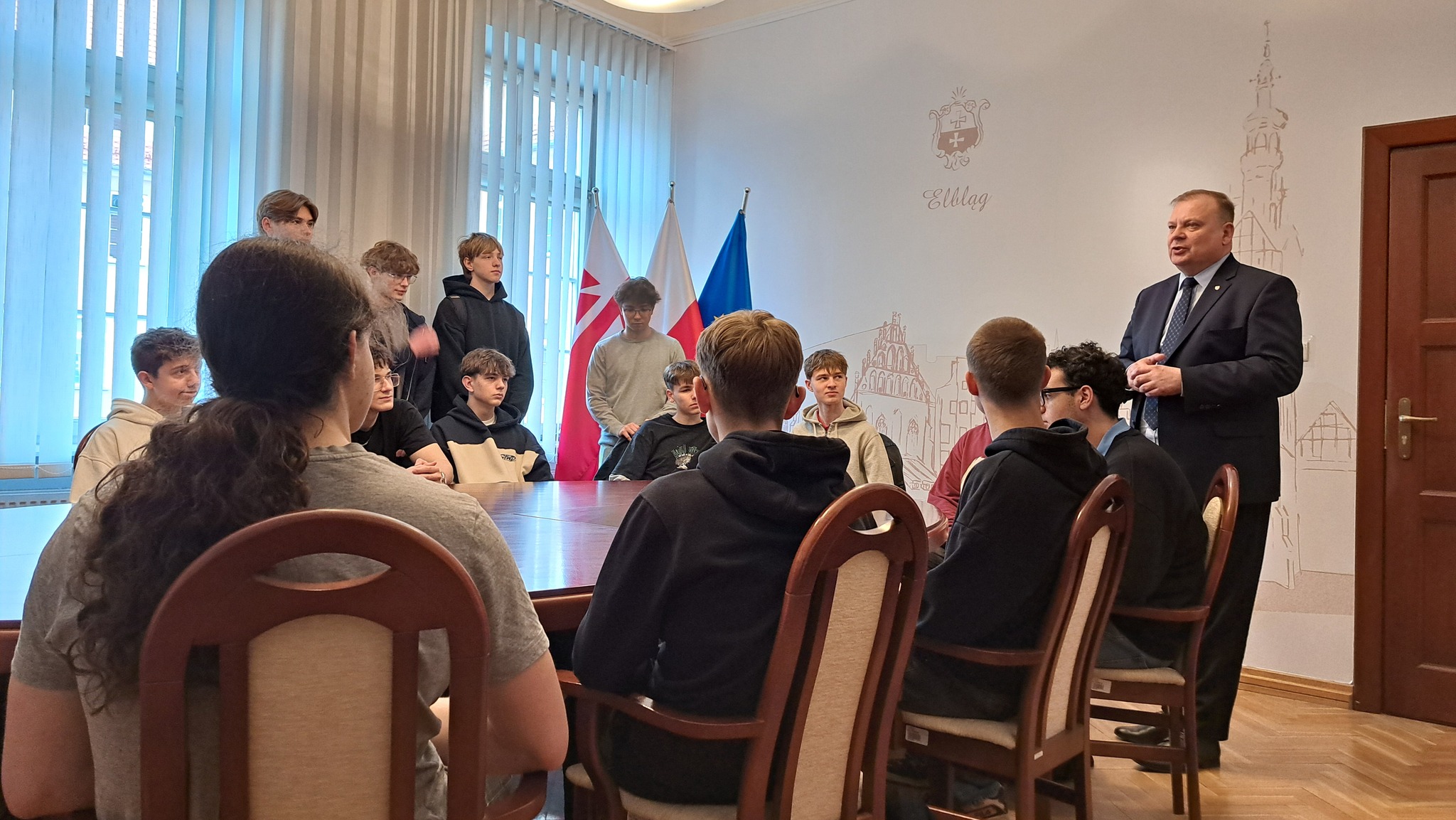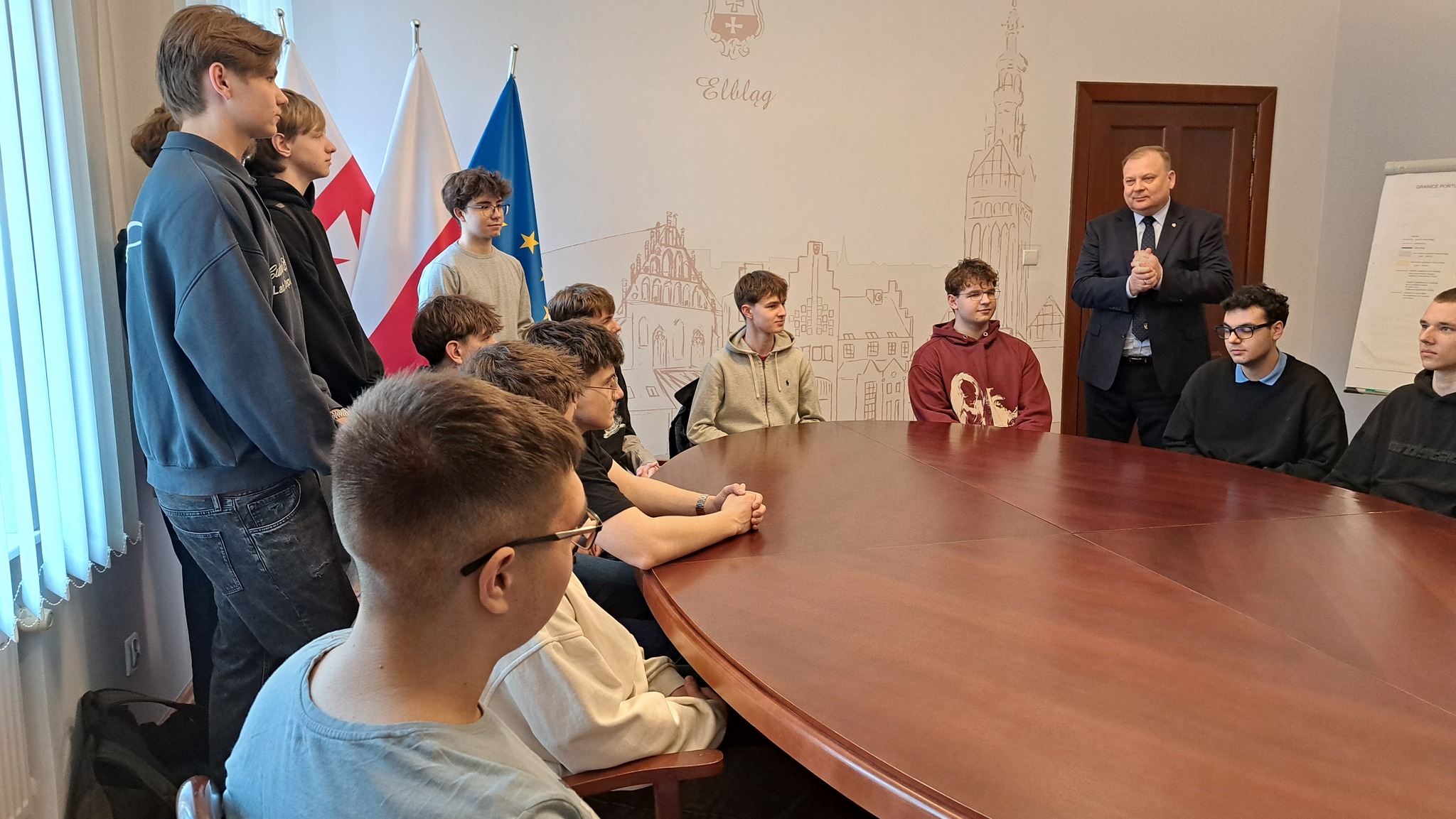Uczniowie klasy 3 F wybrali się w piątek, 17 kwietnia 2026 r. z wizytą do Urzędu Miasta Elbląga. Jak relacjonuje uczeń tej klasy Marek Sztajnke : "Po przybyciu do urzędu zostaliśmy serdecznie przywitani i odprowadzeni do sali, gdzie w oczekiwaniu na spotkanie, zachęcano nas do zadawania pytań Panu Prezydentowi. Prezydent dr Michał Missan, wchodząc do sali, przeprosił za lekkie spóźnienie spowodowane wcześniejszymi spotkaniami. Następnie zaczęliśmy zadawać mu nurtujące nas pytania dotyczące inwestycji, które podjął w trakcie swojej kadencji, oraz możliwych metod dalszego rozwoju miasta. Prezydent chętnie odpowiadał na nasze pytania, dodając wiele szczegółów i opowiadając o interesujących aspektach swojej pracy. Po zakończeniu rozmowy Prezydent oprowadził nas po swoim gabinecie i wręczył nam paczkę słodyczy. Następnie mieliśmy okazję zobaczyć salę obrad Rady Miasta, gdzie opowiedziano nam o krokach, które należy podjąć, aby zostać urzędnikiem. Na koniec przedstawiono nam możliwości wsparcia miasta w tworzeniu przedsięwzięć, co zakończyło naszą wizytę.” Nie obyło się bez pamiątkowego zdjęcia z Panem Prezydentem dr Michałem Missanem „na ściance”.