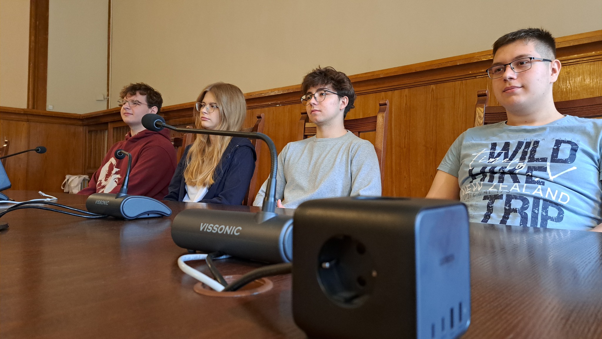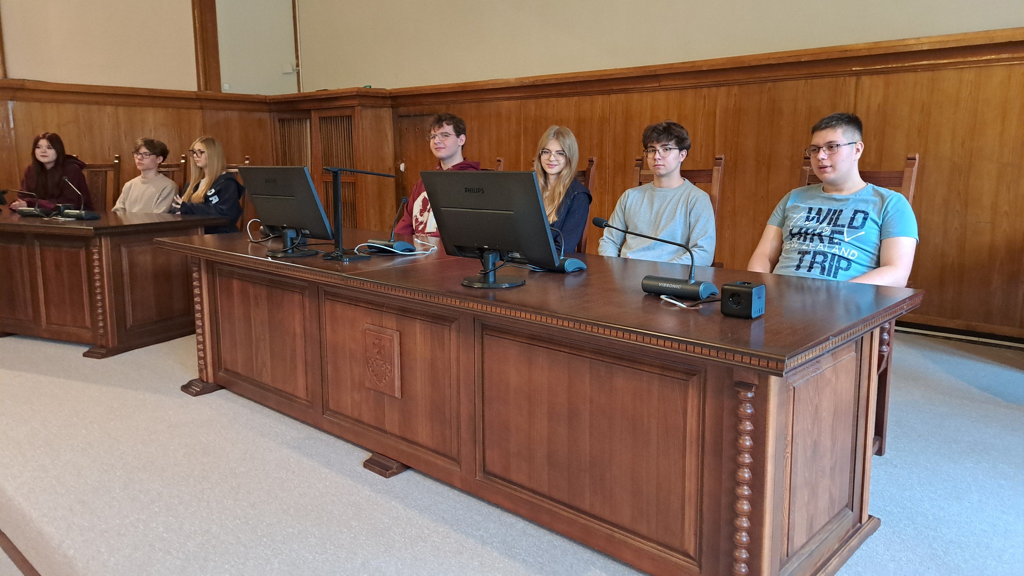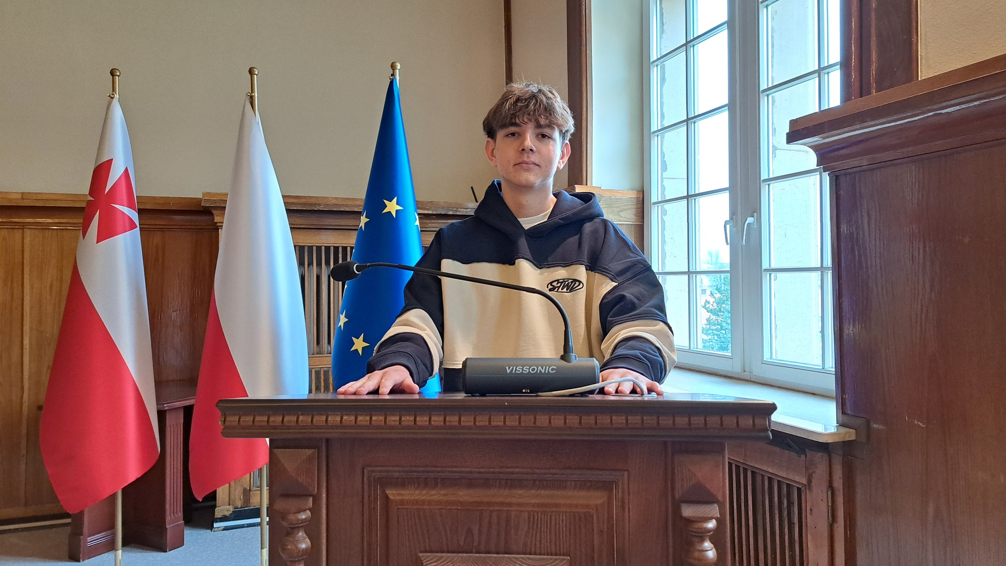 Uczniowie klasy 3 F wybrali się w piątek, 17 kwietnia 2026 r. z wizytą do Urzędu Miasta Elbląga. Jak relacjonuje uczeń tej klasy Marek Sztajnke : "Po przybyciu do urzędu zostaliśmy serdecznie przywitani i odprowadzeni do sali, gdzie w oczekiwaniu na spotkanie, zachęcano nas do zadawania pytań Panu Prezydentowi. Prezydent dr Michał Missan, wchodząc do sali, przeprosił za lekkie spóźnienie spowodowane wcześniejszymi spotkaniami. Następnie zaczęliśmy zadawać mu nurtujące nas pytania dotyczące inwestycji, które podjął w trakcie swojej kadencji, oraz możliwych metod dalszego rozwoju miasta. Prezydent chętnie odpowiadał na nasze pytania, dodając wiele szczegółów i opowiadając o interesujących aspektach swojej pracy. Po zakończeniu rozmowy Prezydent oprowadził nas po swoim gabinecie i wręczył nam paczkę słodyczy. Następnie mieliśmy okazję zobaczyć salę obrad Rady Miasta, gdzie opowiedziano nam o krokach, które należy podjąć, aby zostać urzędnikiem. Na koniec przedstawiono nam możliwości wsparcia miasta w tworzeniu przedsięwzięć, co zakończyło naszą wizytę.” Nie obyło się bez pamiątkowego zdjęcia z Panem Prezydentem dr Michałem Missanem „na ściance”.