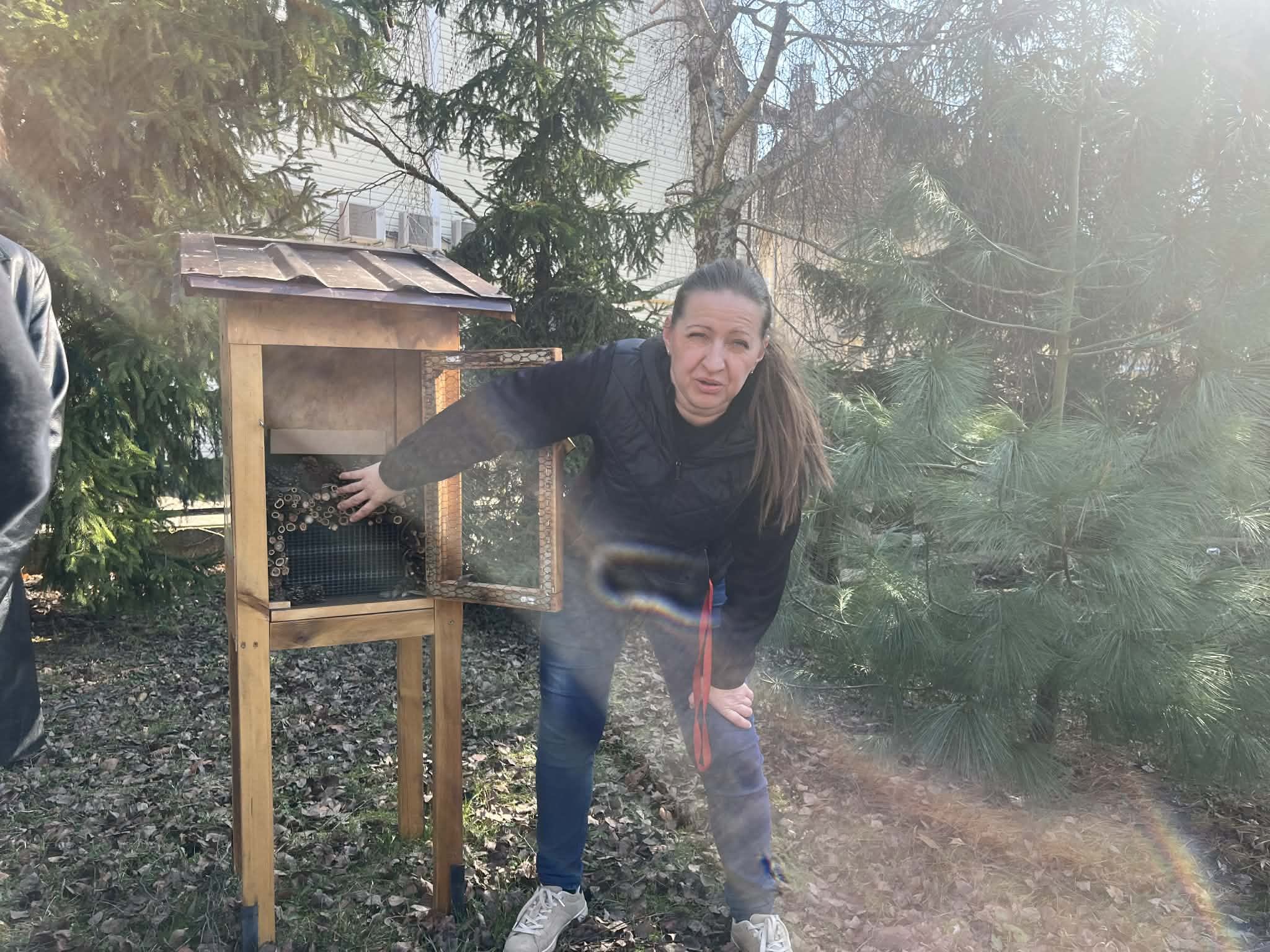 Uczniowie dowiedzieli się, jakie domki można budować lub kupować dla owadów – zwłaszcza dla pszczół murarek – aby zapewnić im bezpieczne miejsce do życia i rozmnażania.