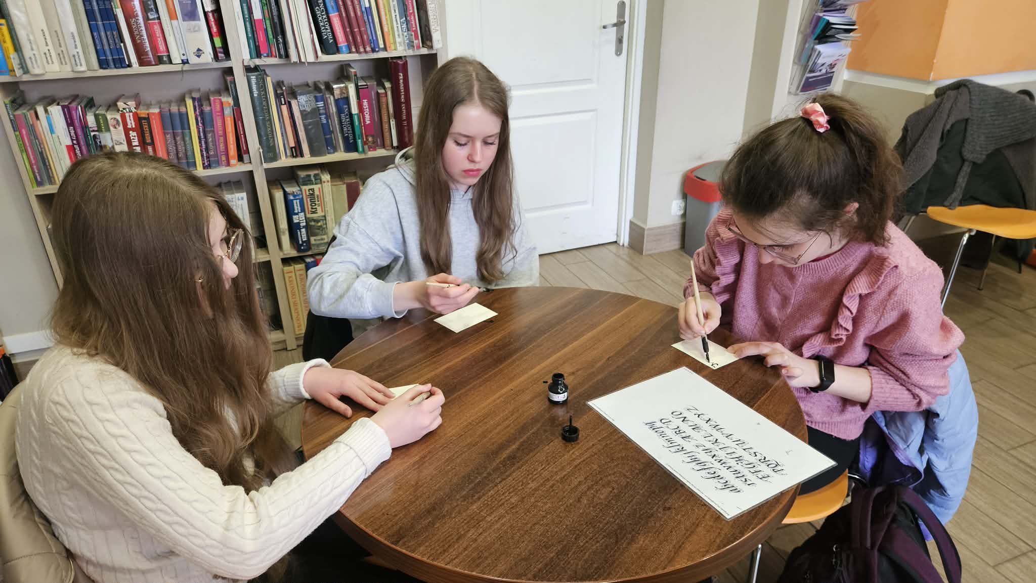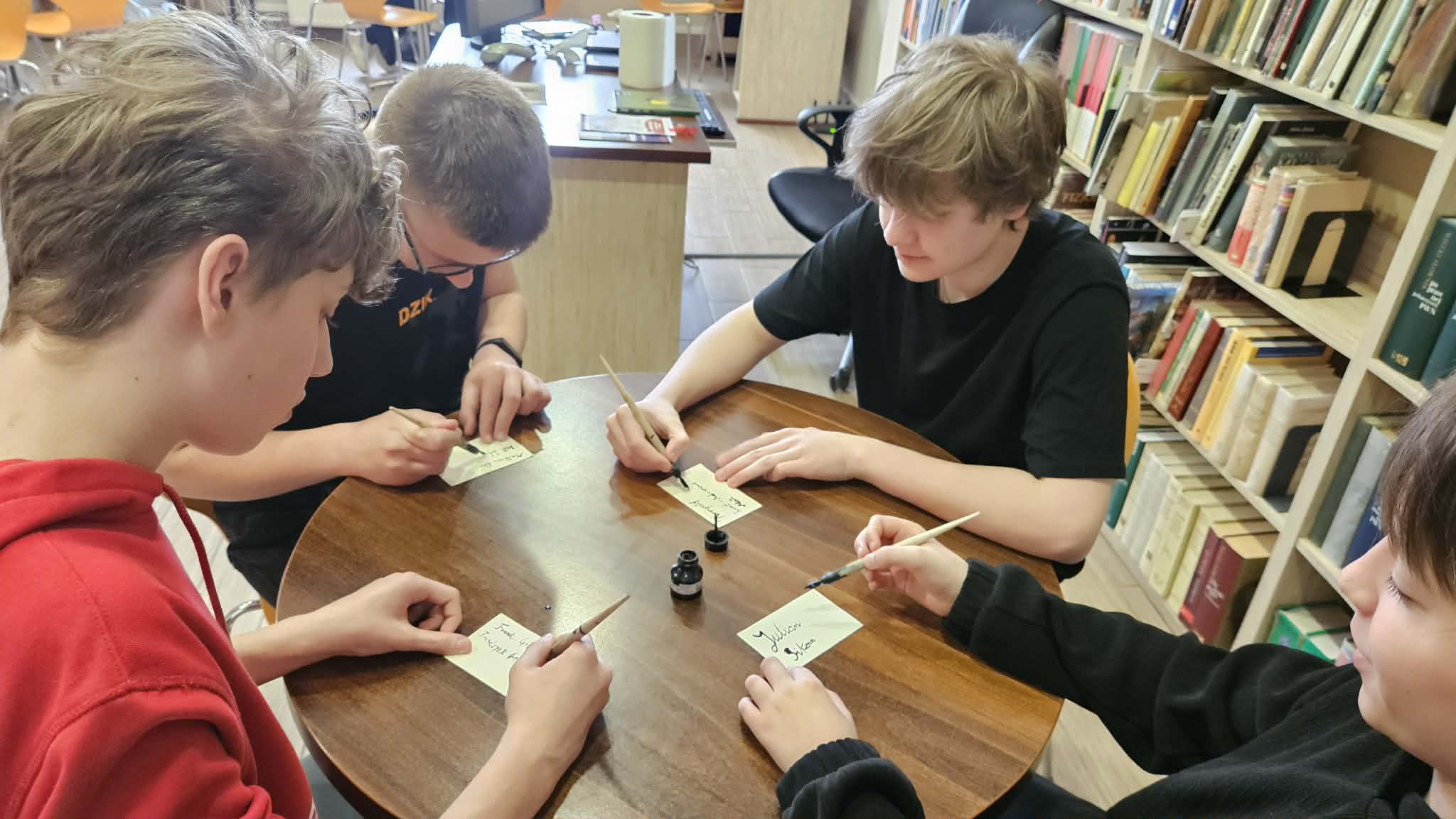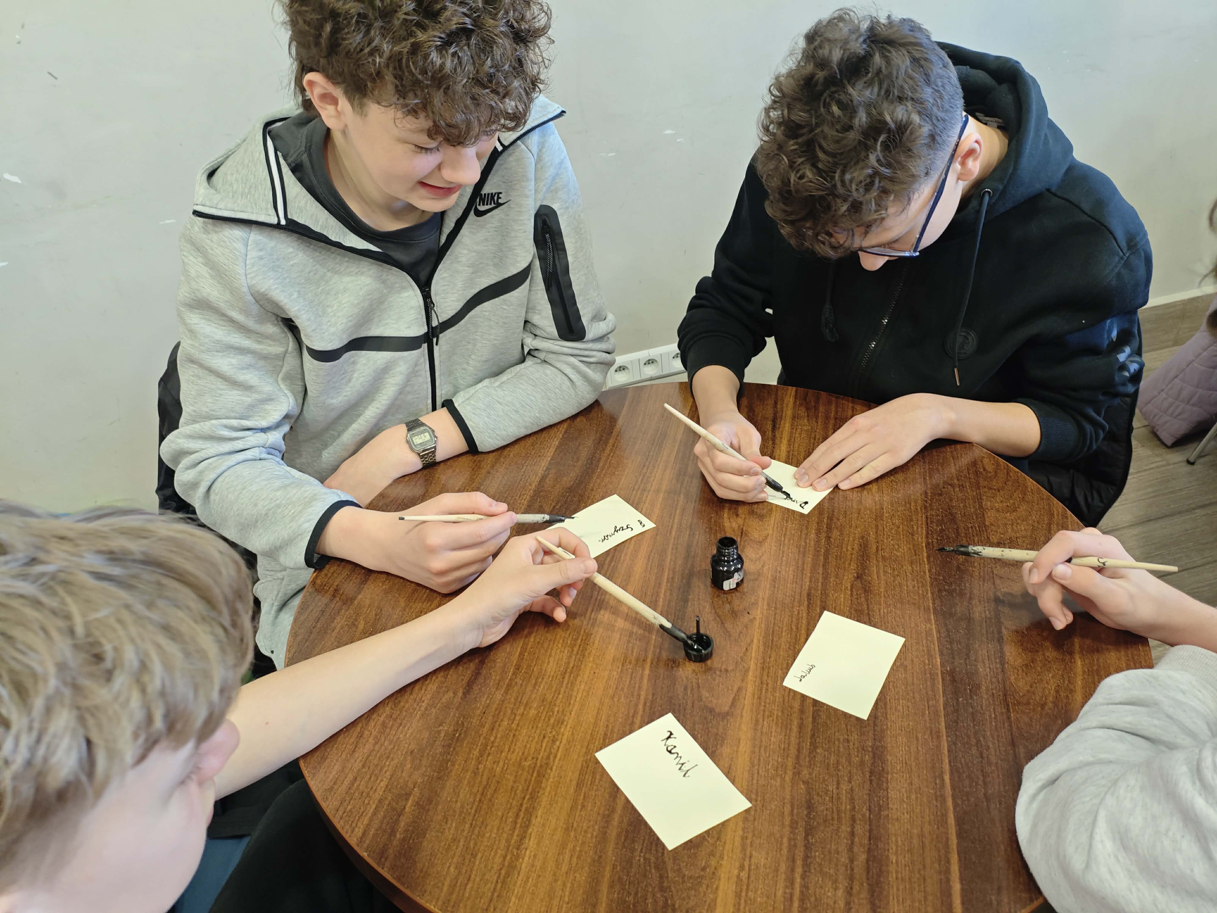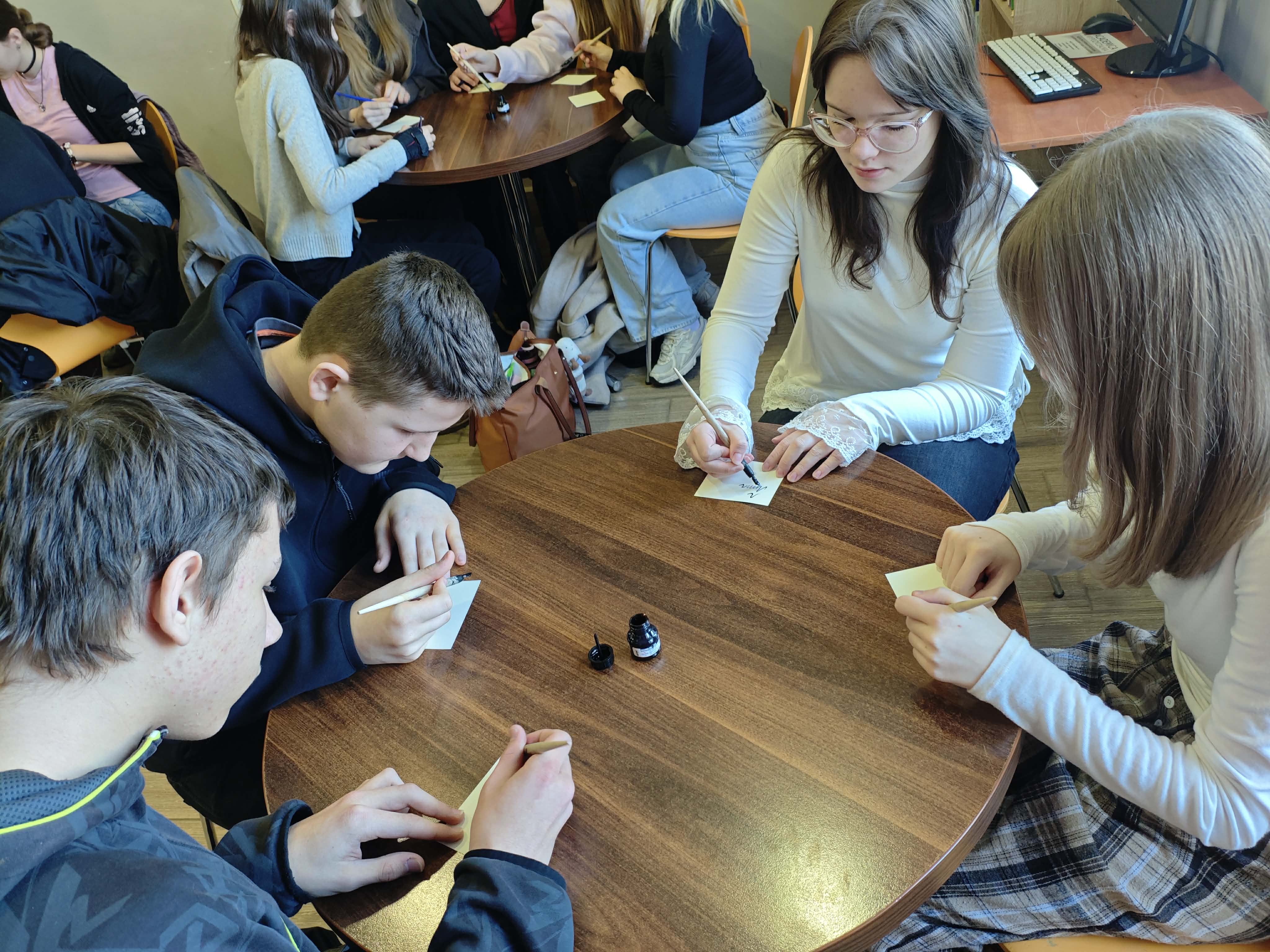 Po części informacyjnej przystąpiliśmy do części warsztatowej spotkania – wprawek w pisaniu kaligraficznym przy użyciu tradycyjnych narzędzi pisarskich. Następnie odbył się etap konkursowy, czyli rozwiązanie quizu sprawdzającego wiadomości z zajęć.