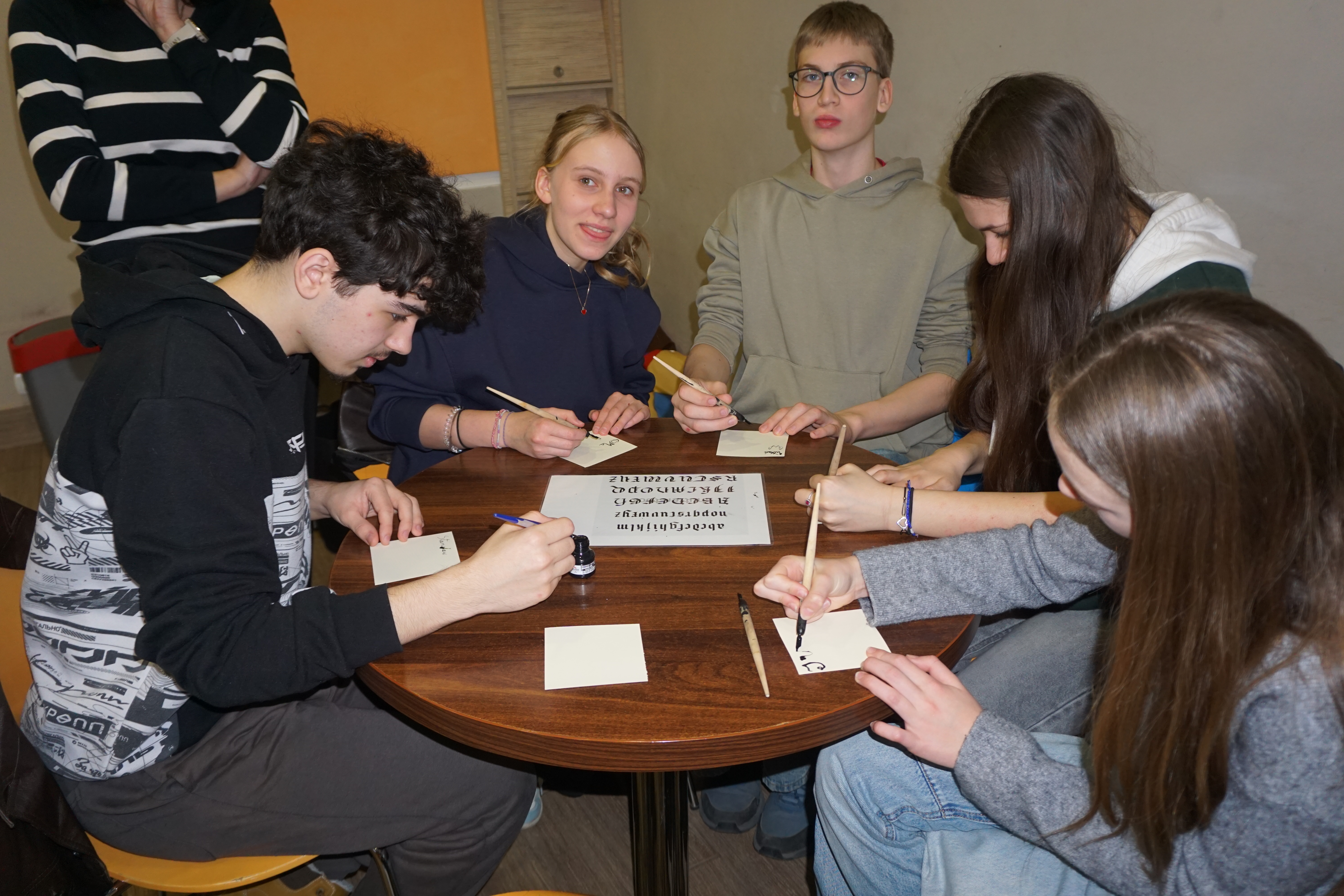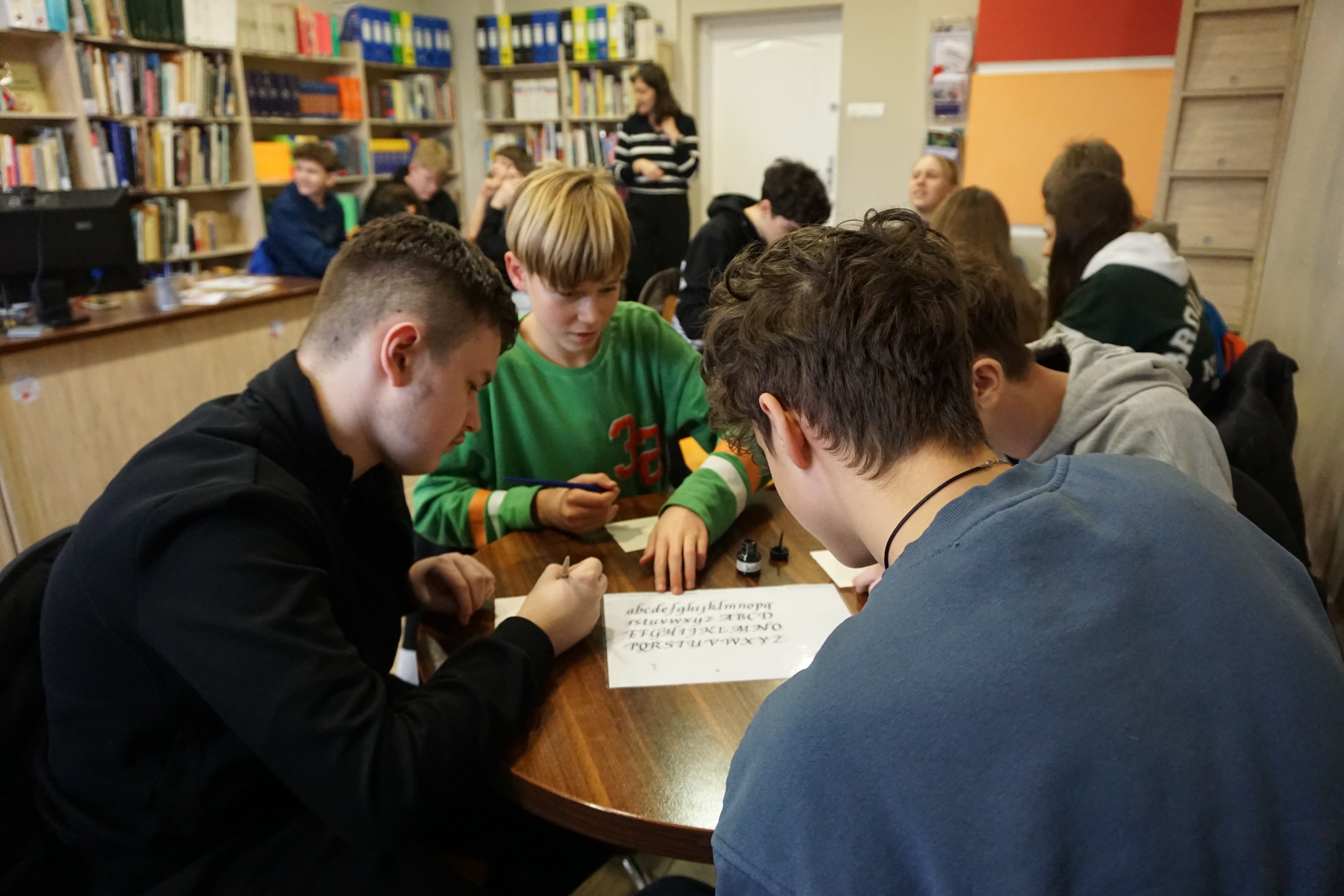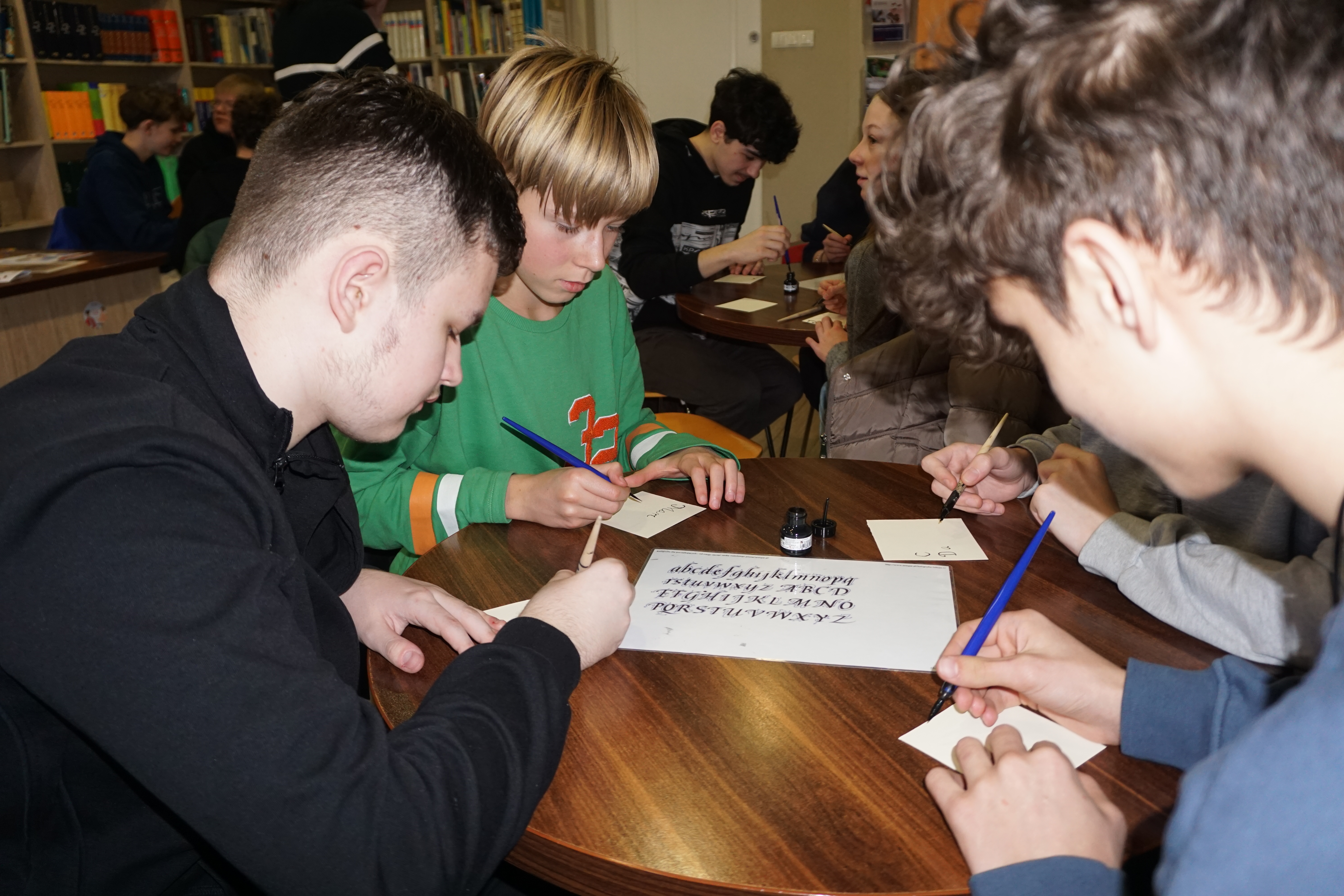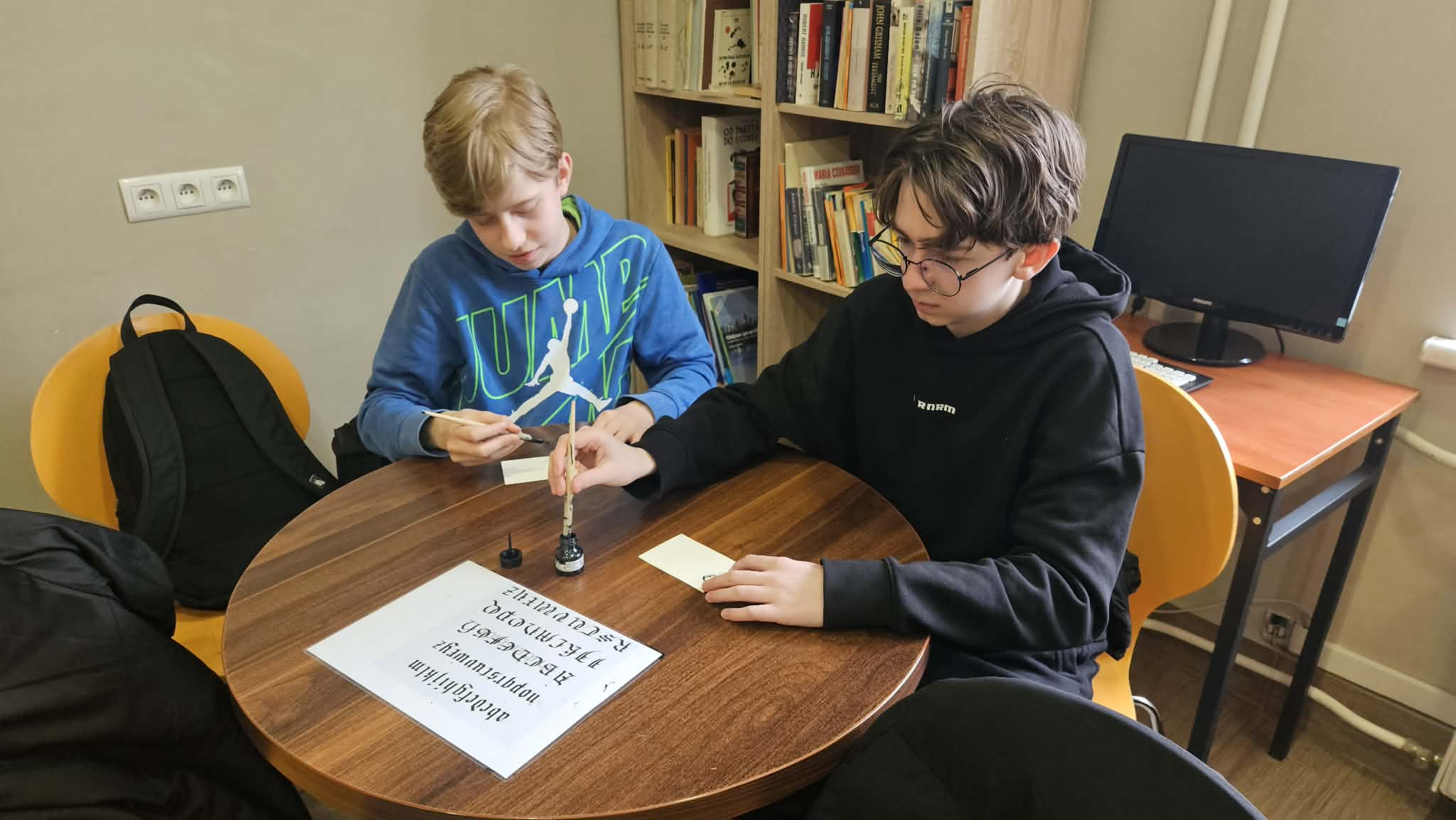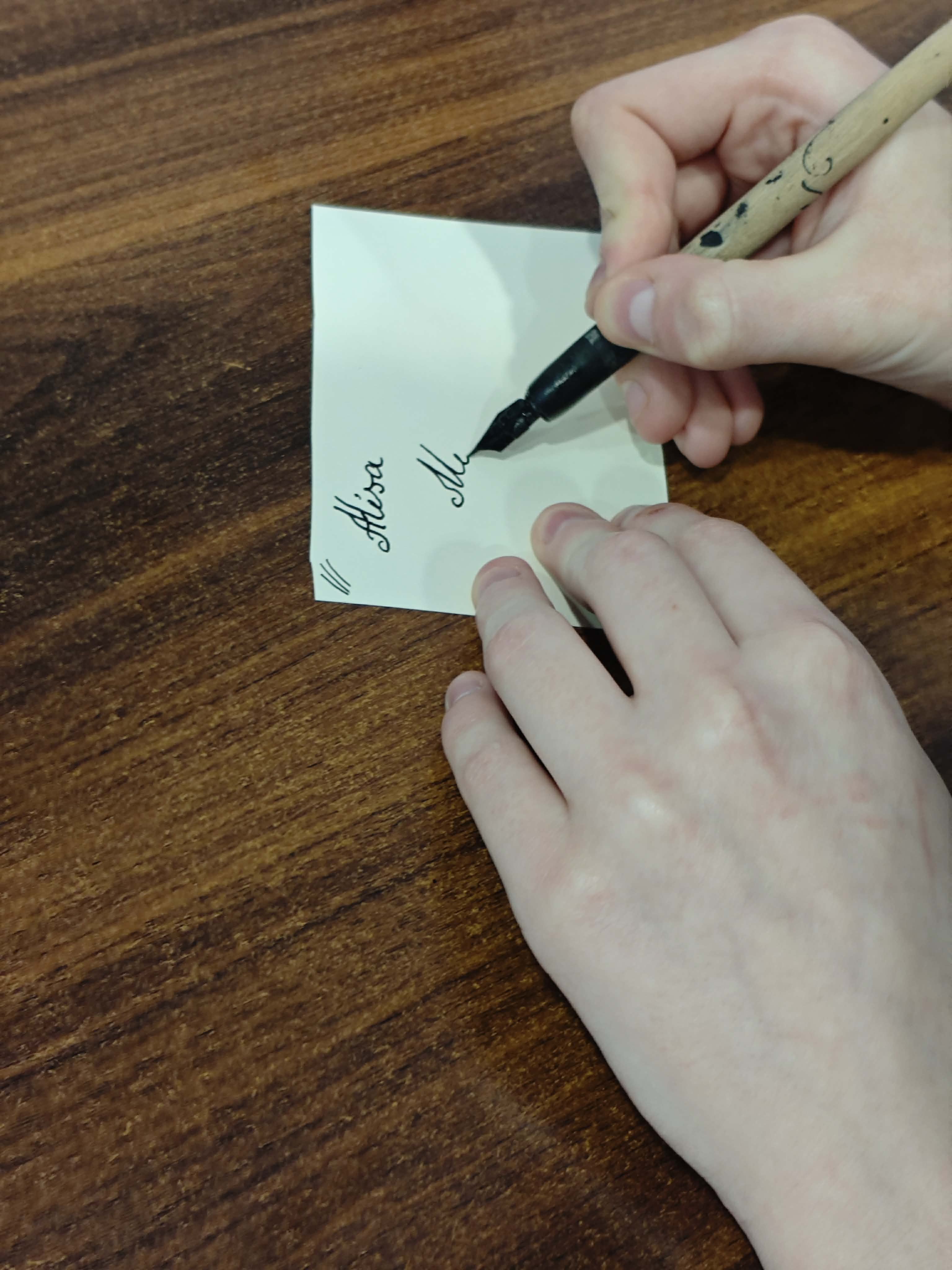 Po części informacyjnej przystąpiliśmy do części warsztatowej spotkania – wprawek w pisaniu kaligraficznym przy użyciu tradycyjnych narzędzi pisarskich. Następnie odbył się etap konkursowy, czyli rozwiązanie quizu sprawdzającego wiadomości z zajęć.