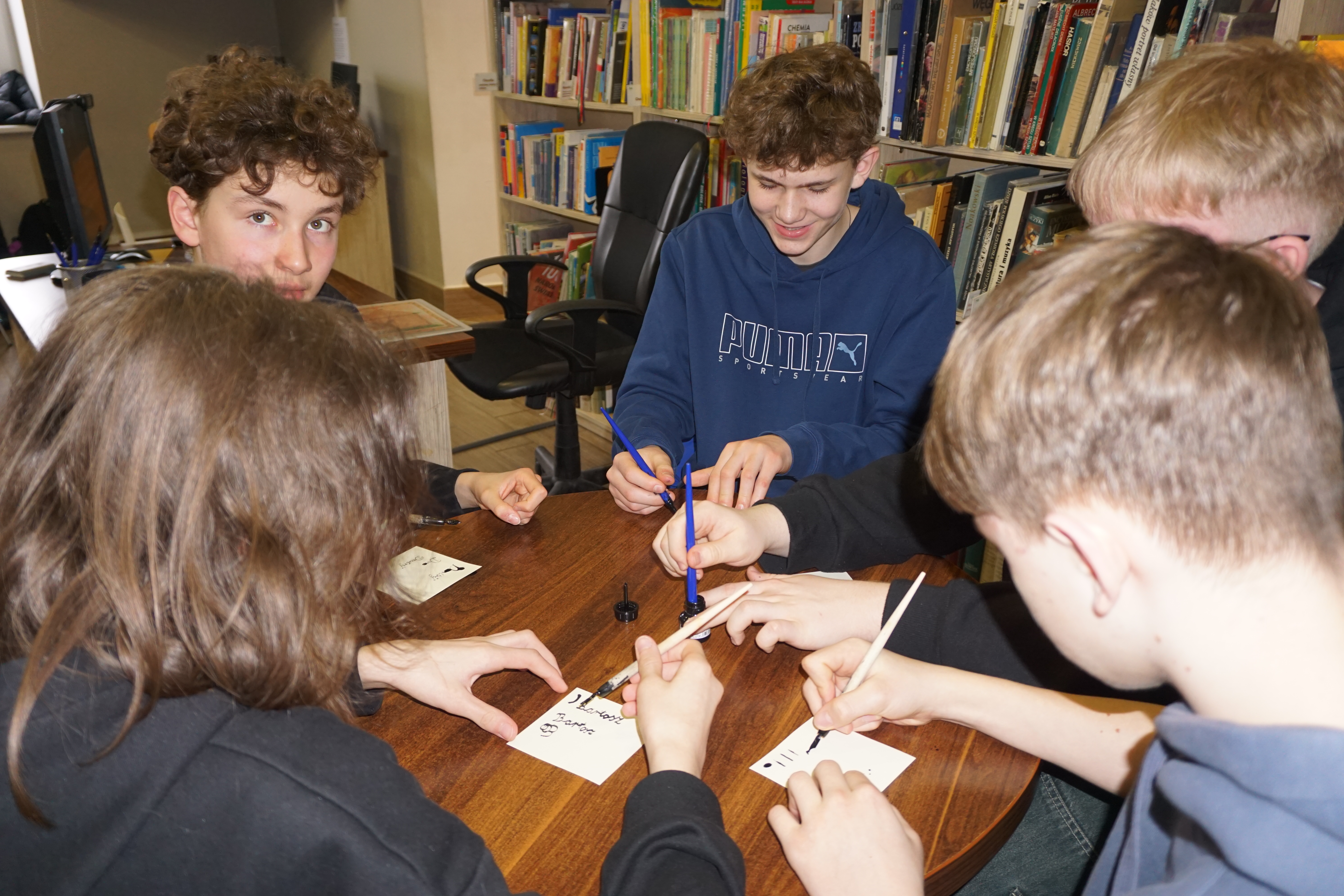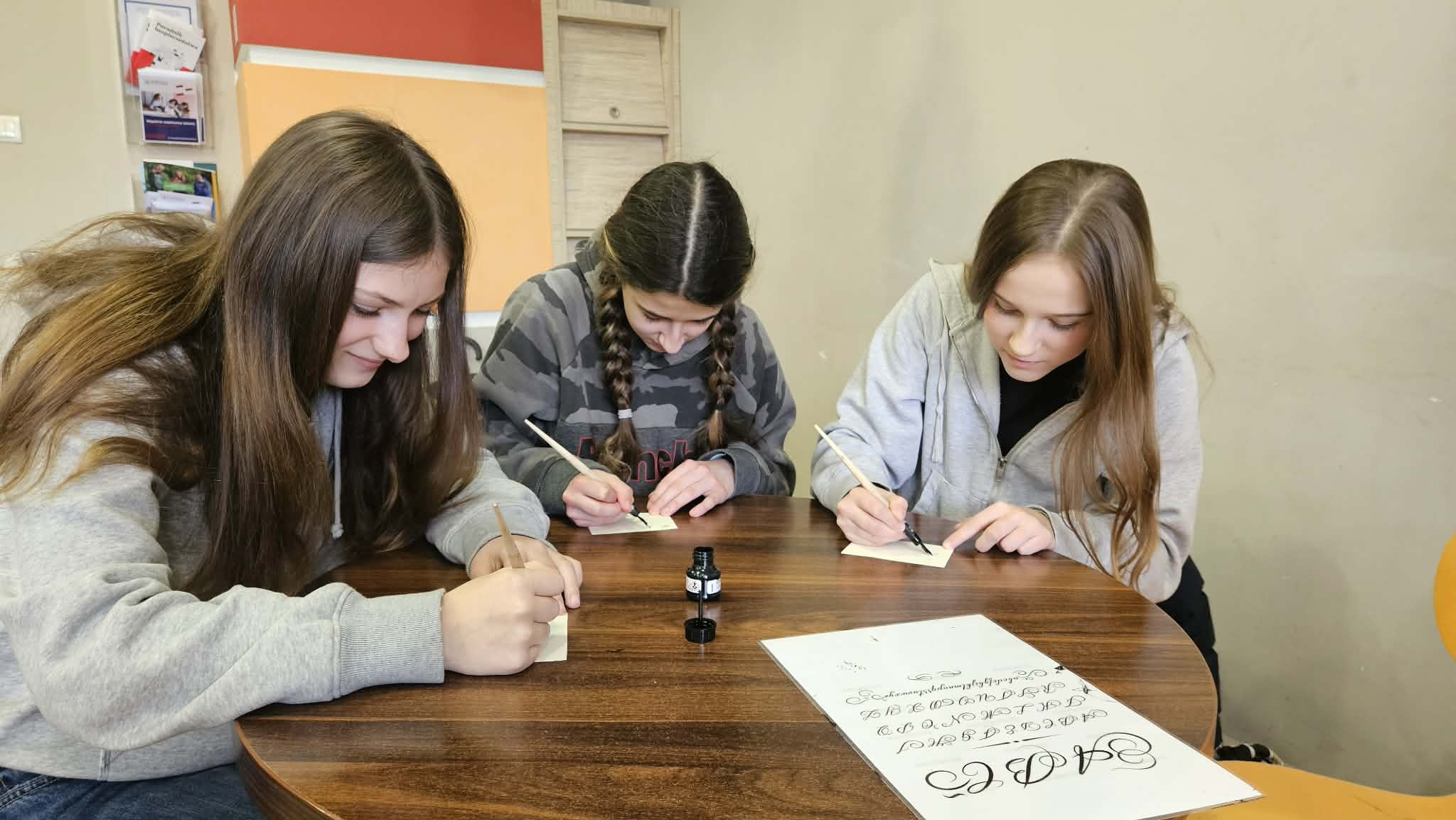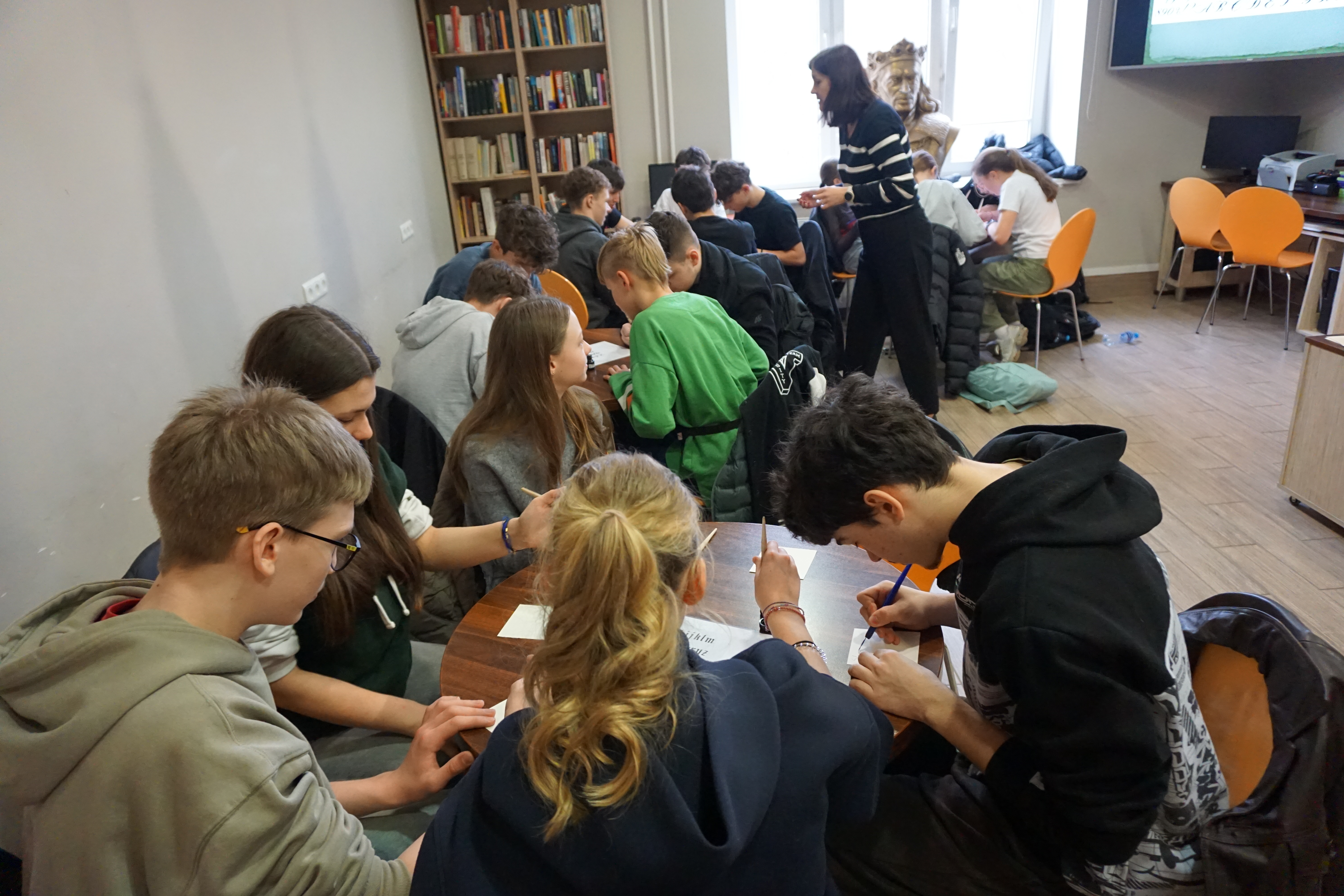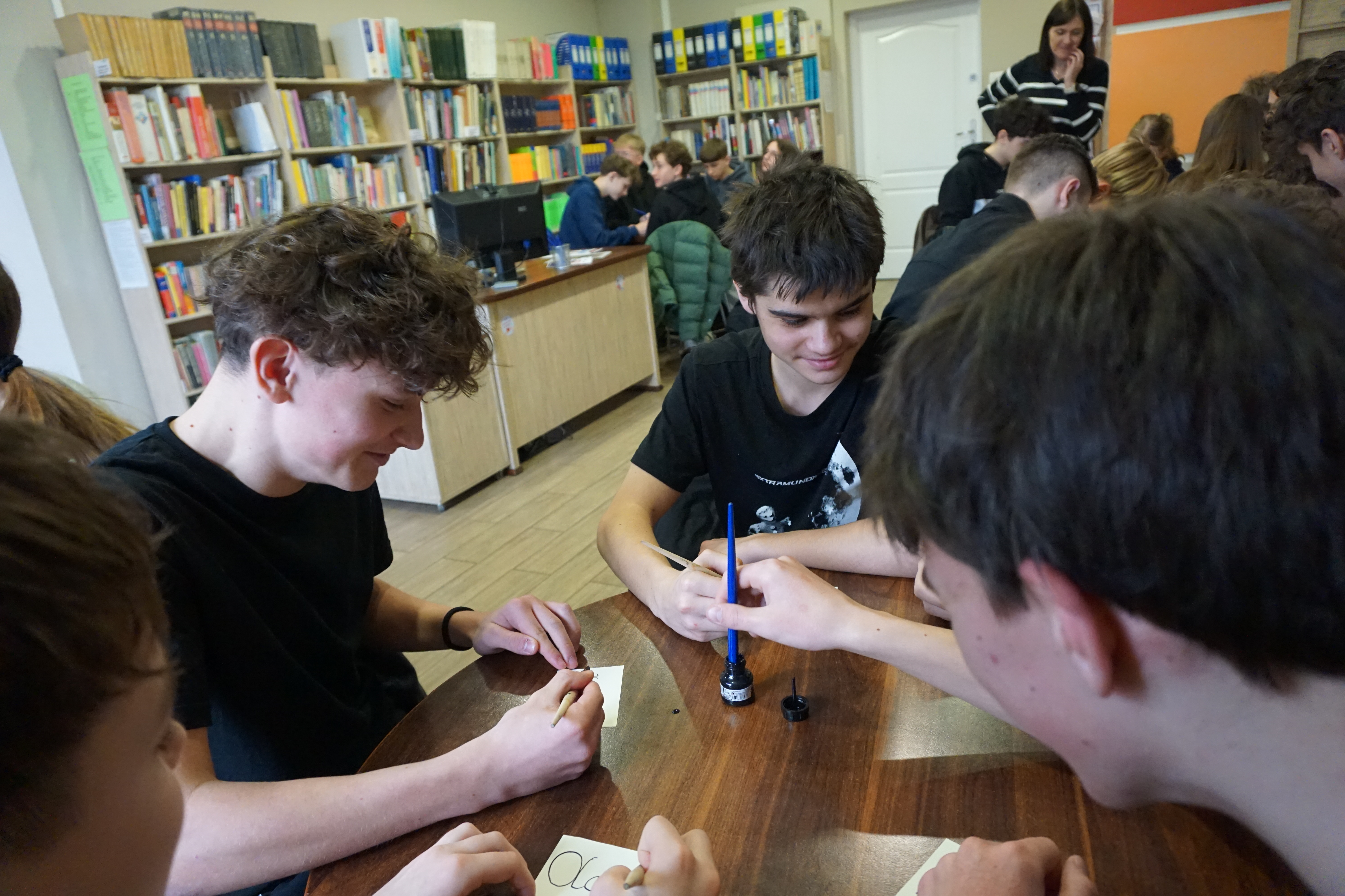 Po części informacyjnej przystąpiliśmy do części warsztatowej spotkania – wprawek w pisaniu kaligraficznym przy użyciu tradycyjnych narzędzi pisarskich. Następnie odbył się etap konkursowy, czyli rozwiązanie quizu sprawdzającego wiadomości z zajęć.
