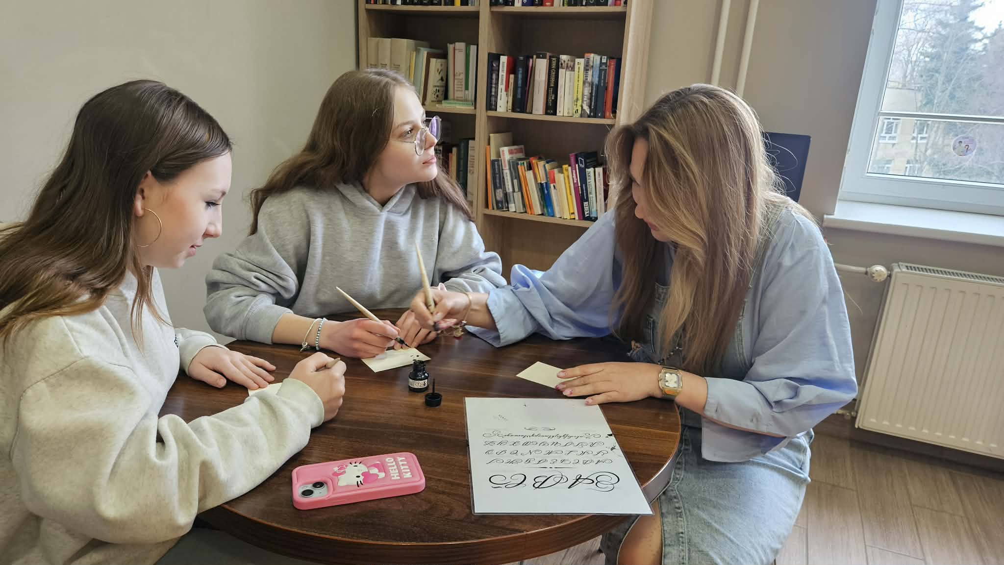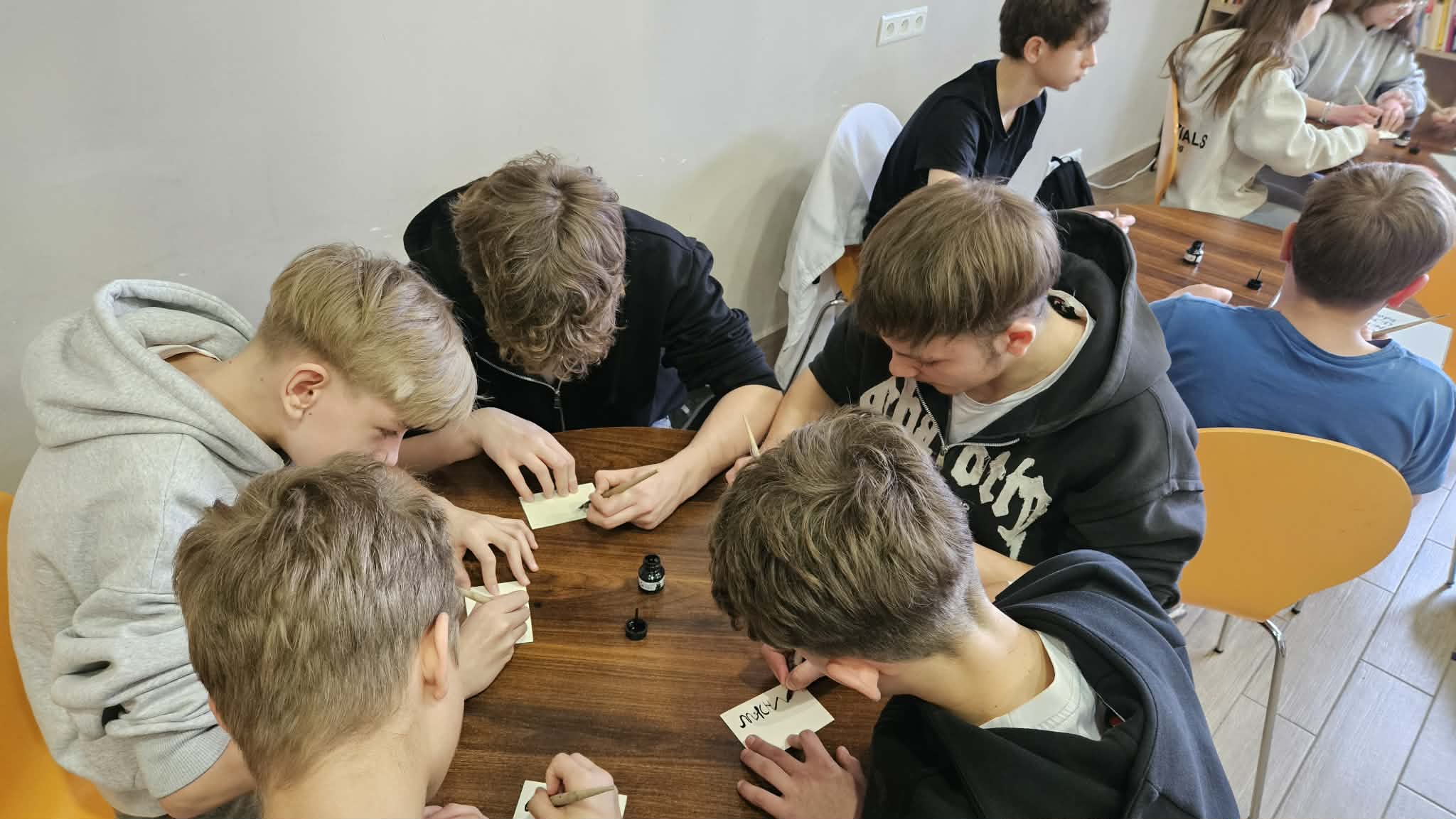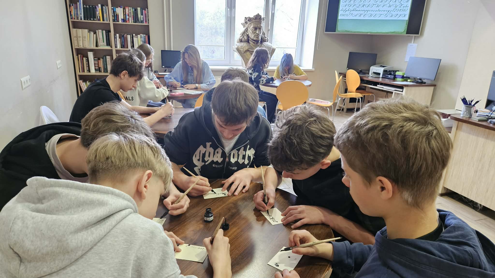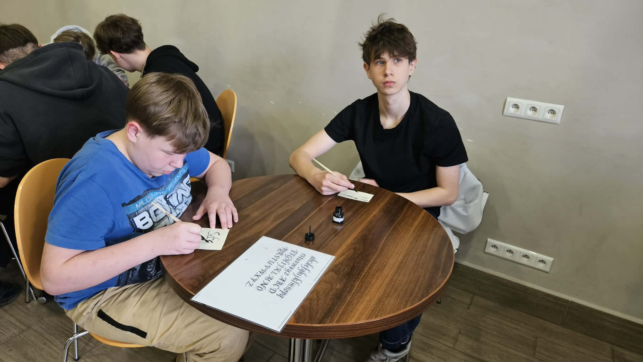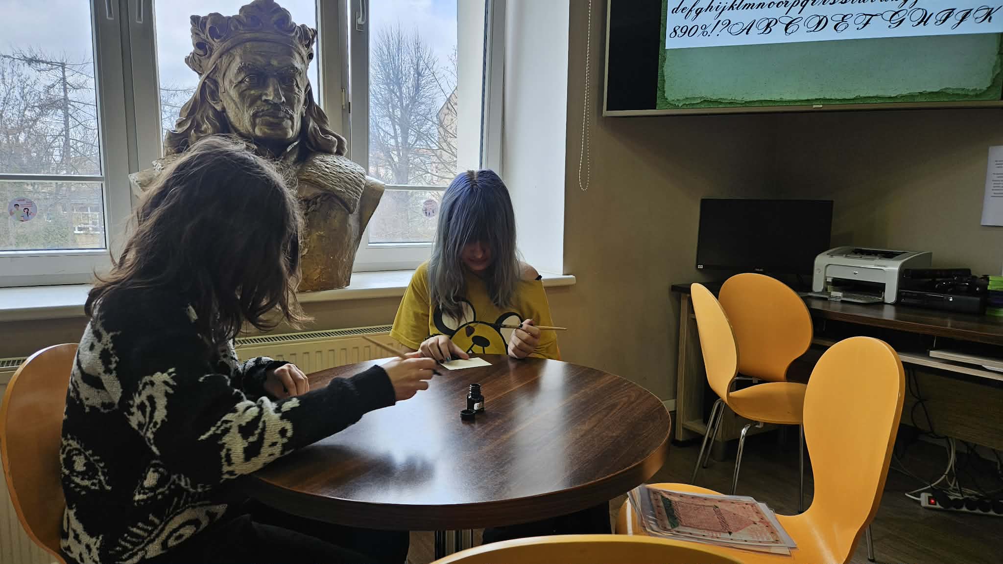 Po części informacyjnej przystąpiliśmy do części warsztatowej spotkania – wprawek w pisaniu kaligraficznym przy użyciu tradycyjnych narzędzi pisarskich. Następnie odbył się etap konkursowy, czyli rozwiązanie quizu sprawdzającego wiadomości z zajęć.