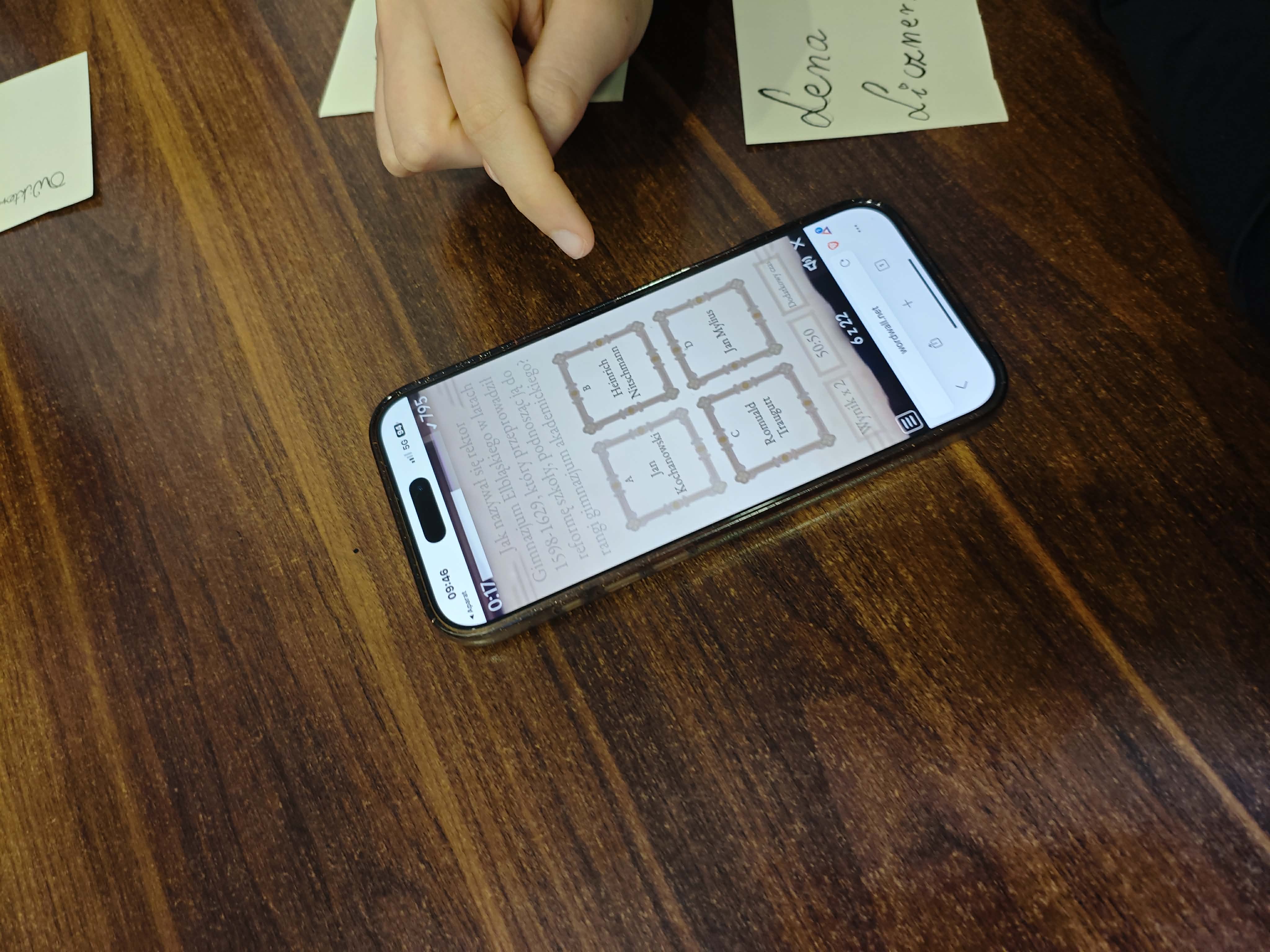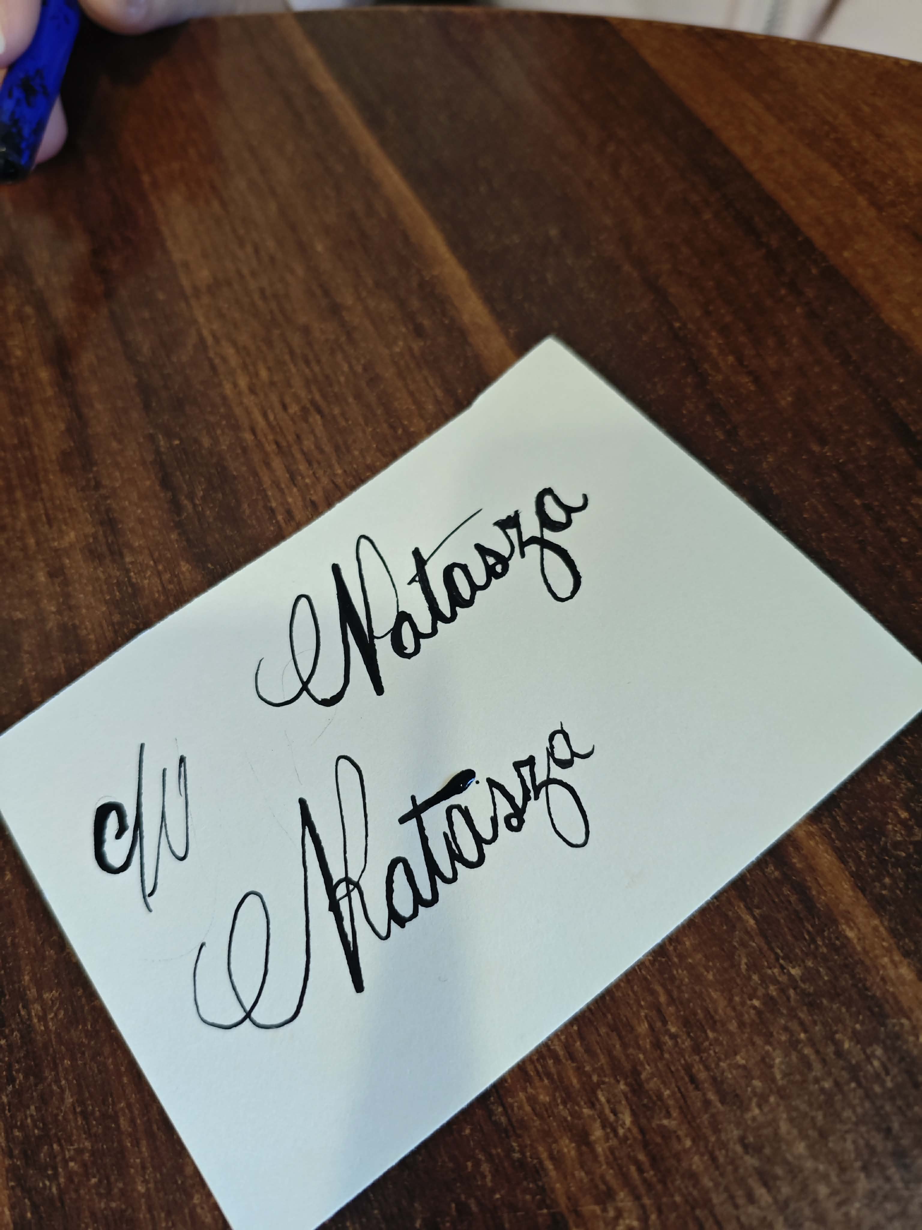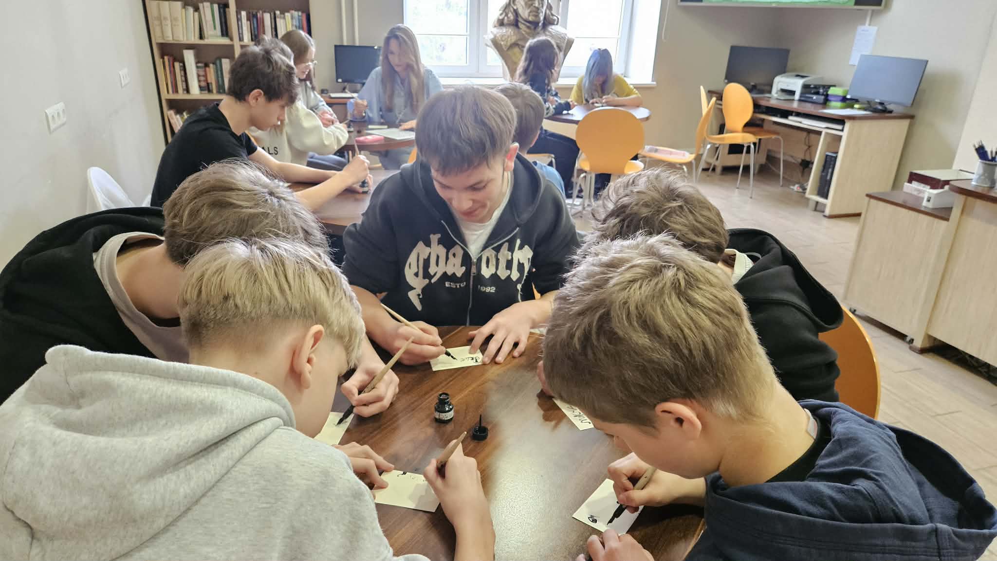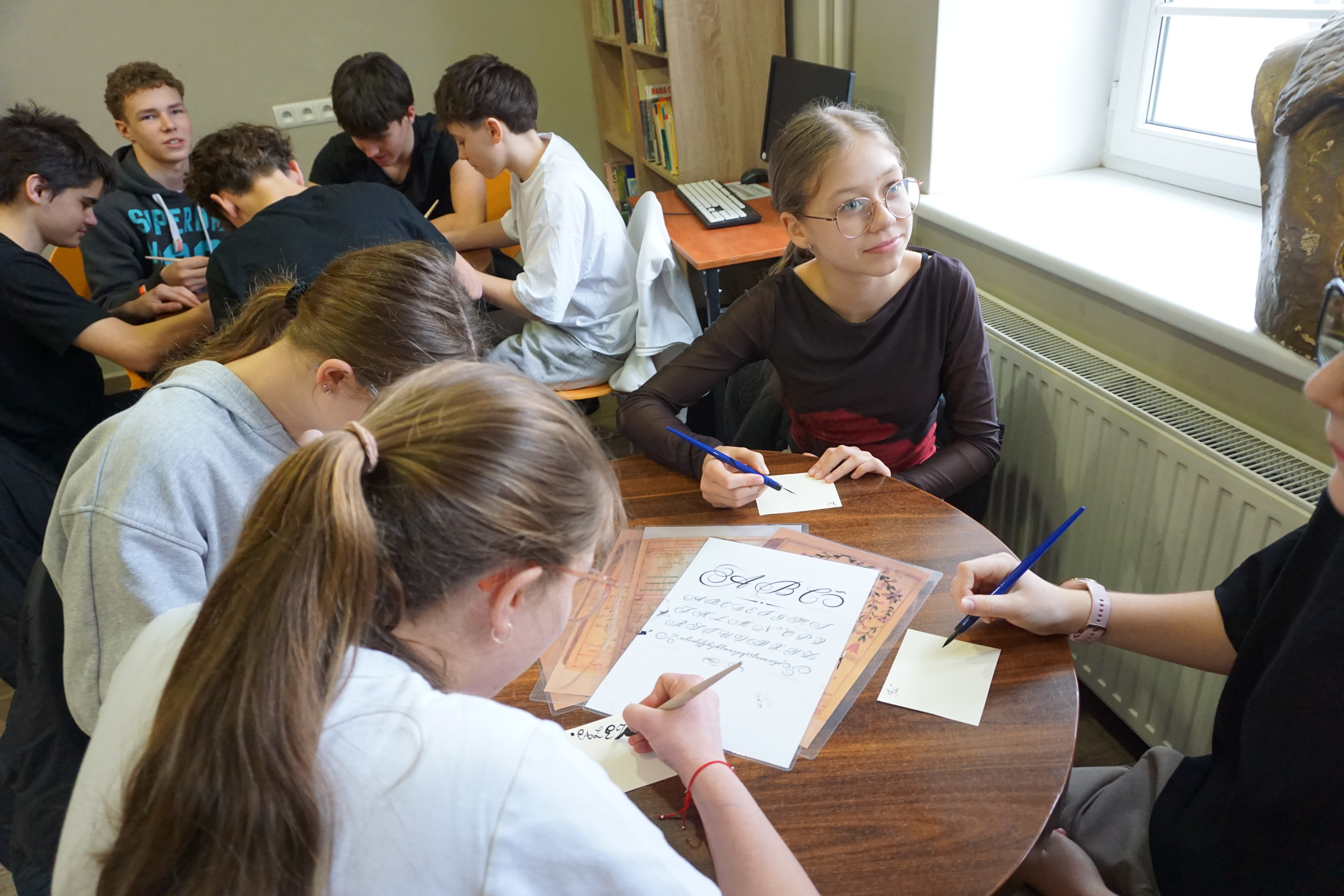 Po części informacyjnej przystąpiliśmy do części warsztatowej spotkania – wprawek w pisaniu kaligraficznym przy użyciu tradycyjnych narzędzi pisarskich. Następnie odbył się etap konkursowy, czyli rozwiązanie quizu sprawdzającego wiadomości z zajęć.