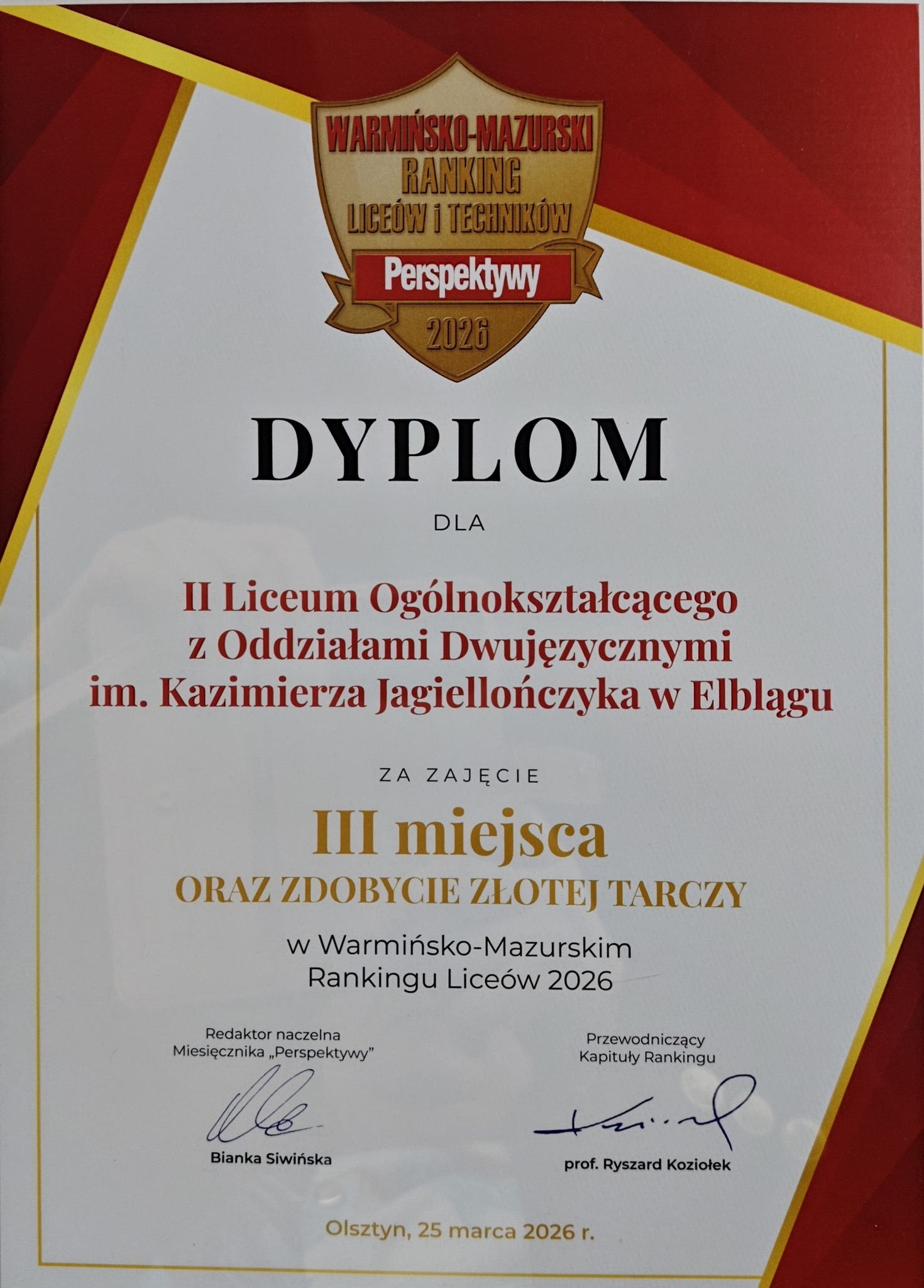 Ten dzień z pewnością na długo pozostanie w pamięci uczestników. Był on symbolem sukcesu, dumy ze swojej szkoły, a jednocześnie inspiracją do dalszej pracy i rozwijania pasji. Złota Tarcza to nie tylko nagroda – to także motywacja, aby kolejne pokolenia uczniów II Liceum Ogólnokształcącego w Elblągu sięgały jeszcze wyżej i odważnie realizowały swoje marzenia.